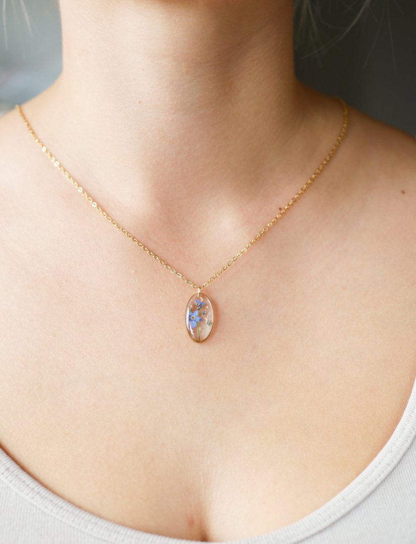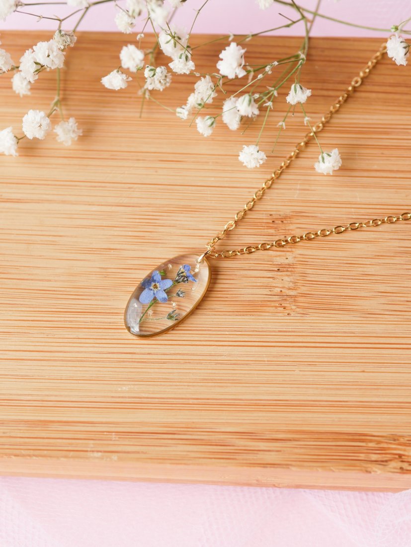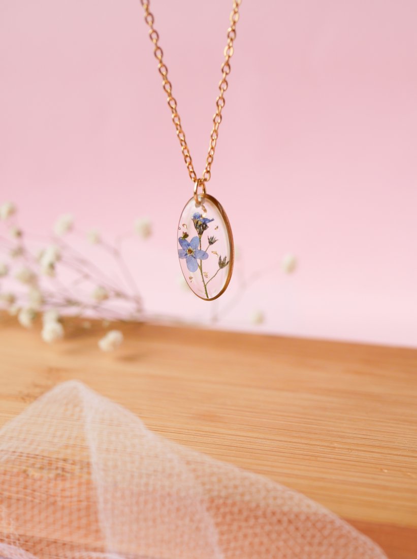 Naszyjnik w kształcie owalu z prawdziwą niezapominajką z Podhalańskich łąk zatopiona w krystalicznej żywicy.