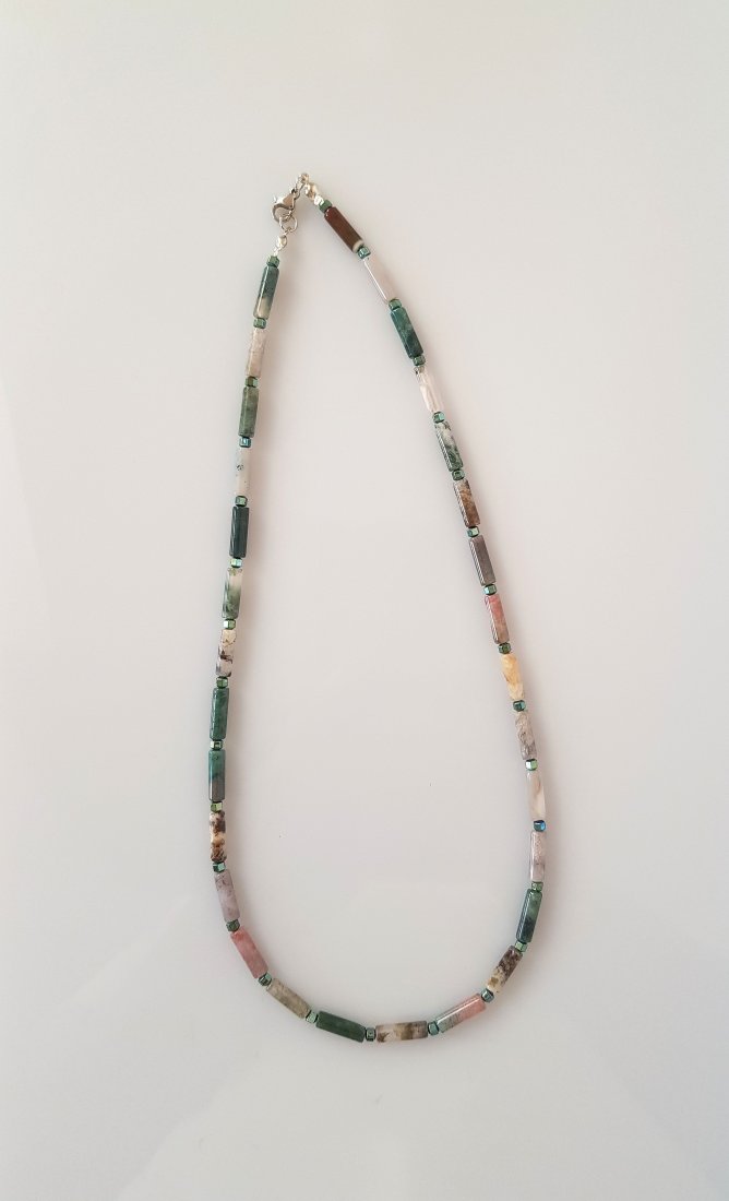 Agat indyjski w zachwycających kolorach ziemi i dodający industrialnego charakteru jasno zielony błyszczący hematyt.