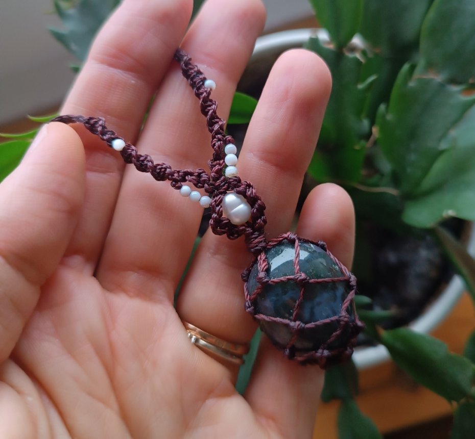 Naszyjnik z agatem mszystym (wielkość kamienia to 2/ 2,9 cm). Dodatkowe kamienie to perła słodkowodna i koraliki z masy perłowej.