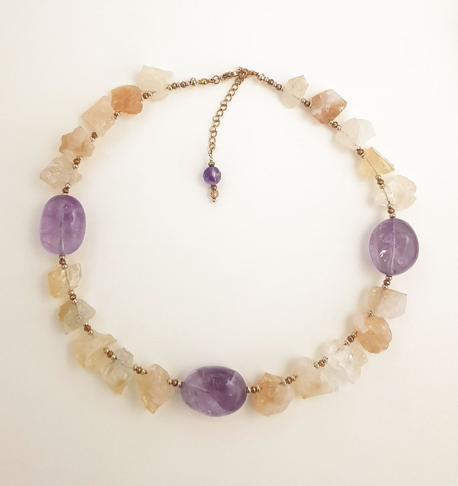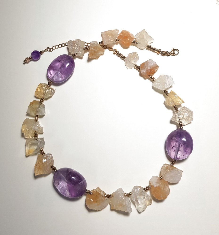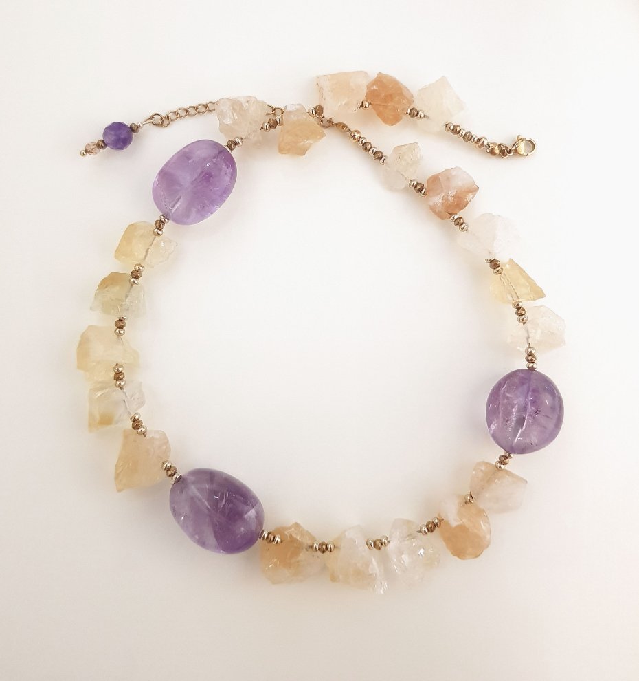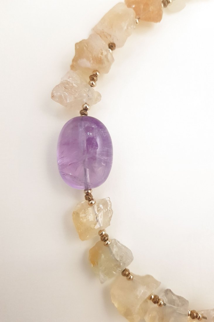 Zapleciona z surowych nieregularnych bryłek cytrynu oraz pięknych dużych szlifowanych ametystów.