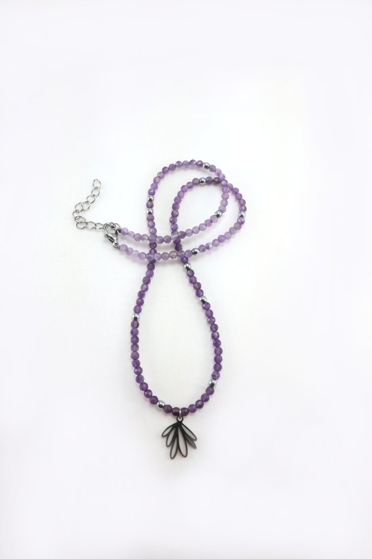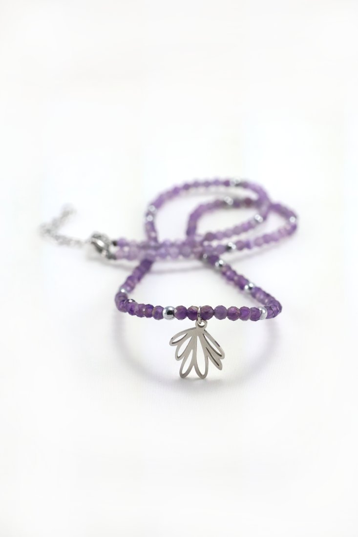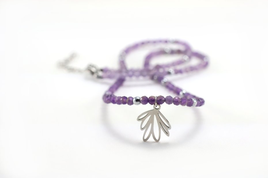 Naszyjnik z naturalnego ametystu i zawieszki to dodatek, który ma również głębokie przesłanie, które ma przywrócić równowagę emocjonalną, złagodzić stres i uwolnić od negatywnych myśli. Minimalistyczny i elegancki design sprawia, że naszyjnik pasuje zarówno do codziennych, casualowych stylizacji, jak i na specjalne okazje. Idealny dla kobiet ceniących sobie styl boho i naturalne piękno.