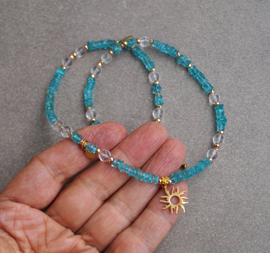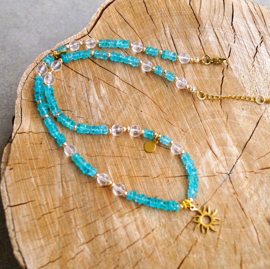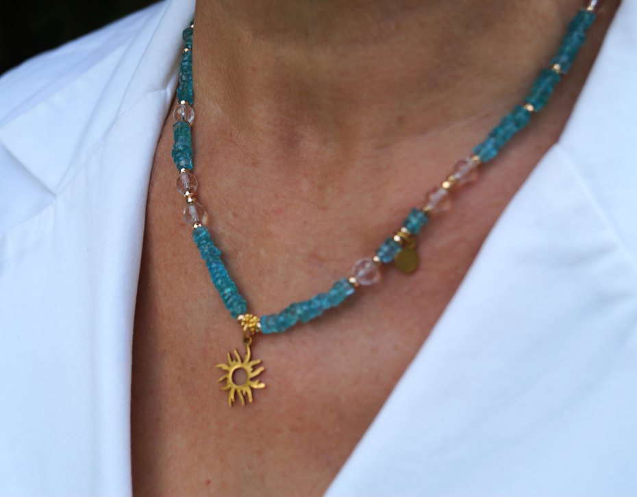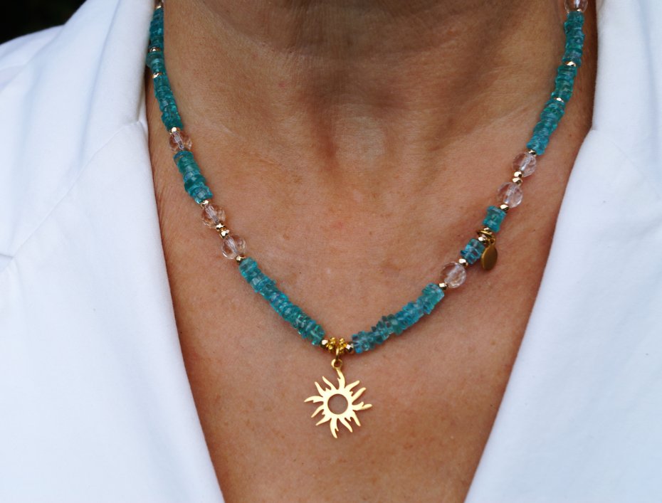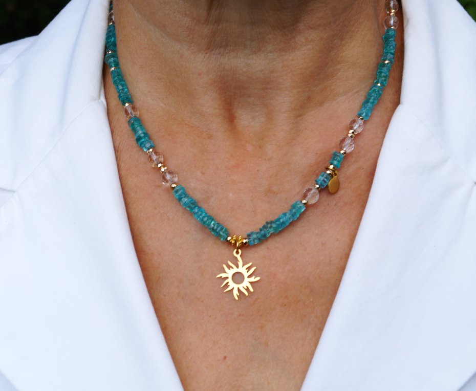 Elegancki naszyjnik wykonany z naturalnych kamieni – fasetowanych oponek apatytu (5–6 mm) oraz fasetowanych kulek kwarcu (6 mm), uzupełnionych przekładkami z hematytu. W centralnym miejscu znajduje się pozłacana zawieszka w kształcie słońca ze stali szlachetnej, która pięknie odbija światło i dodaje całości blasku.