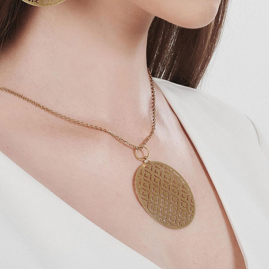 Naszyjnik z ażurowym wzorem inspirowanym orientalnym wzornictwem, w ponadczasowym, złotym odcieniu. Wykonany z wysokiej jakości mosiądzu. Mimo dużego rozmiaru, jego ażurowa budowa sprawia, że jest niezwykle lekki, może być więc noszony na co dzień. Doskonale uzupełni minimalistyczną stylizację, nadając strojowi nienachalnej elegancji i miejskiego szyku. Wisiorek zawieszony jest na łańcuszku wykonanym ze stali chirurgicznej.