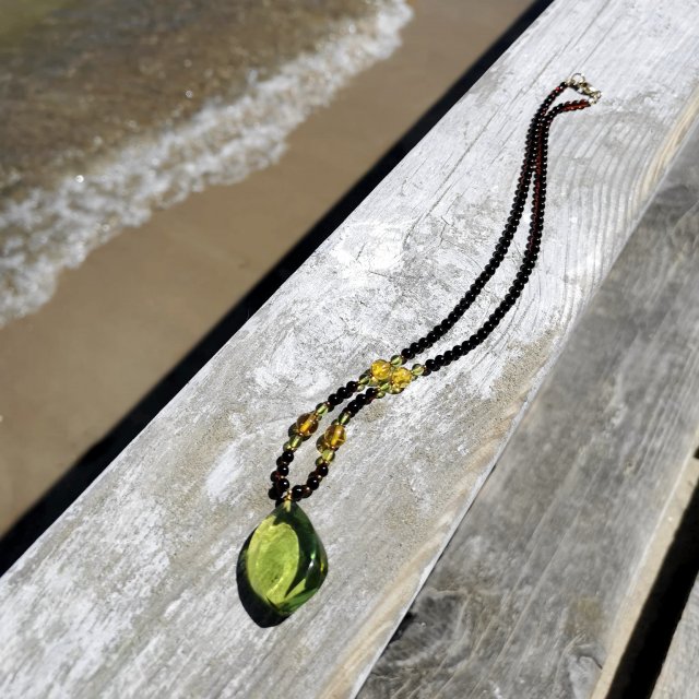 Unikatowy naszyjnik składający się z okrągłych koralików z bursztynu bałtyckiego i karaibskiego ozdobionych wisiorem z bursztynu karaibskiego o kształcie zielonego płomienia. Zapięcie wykonane jest z mosiądzu.