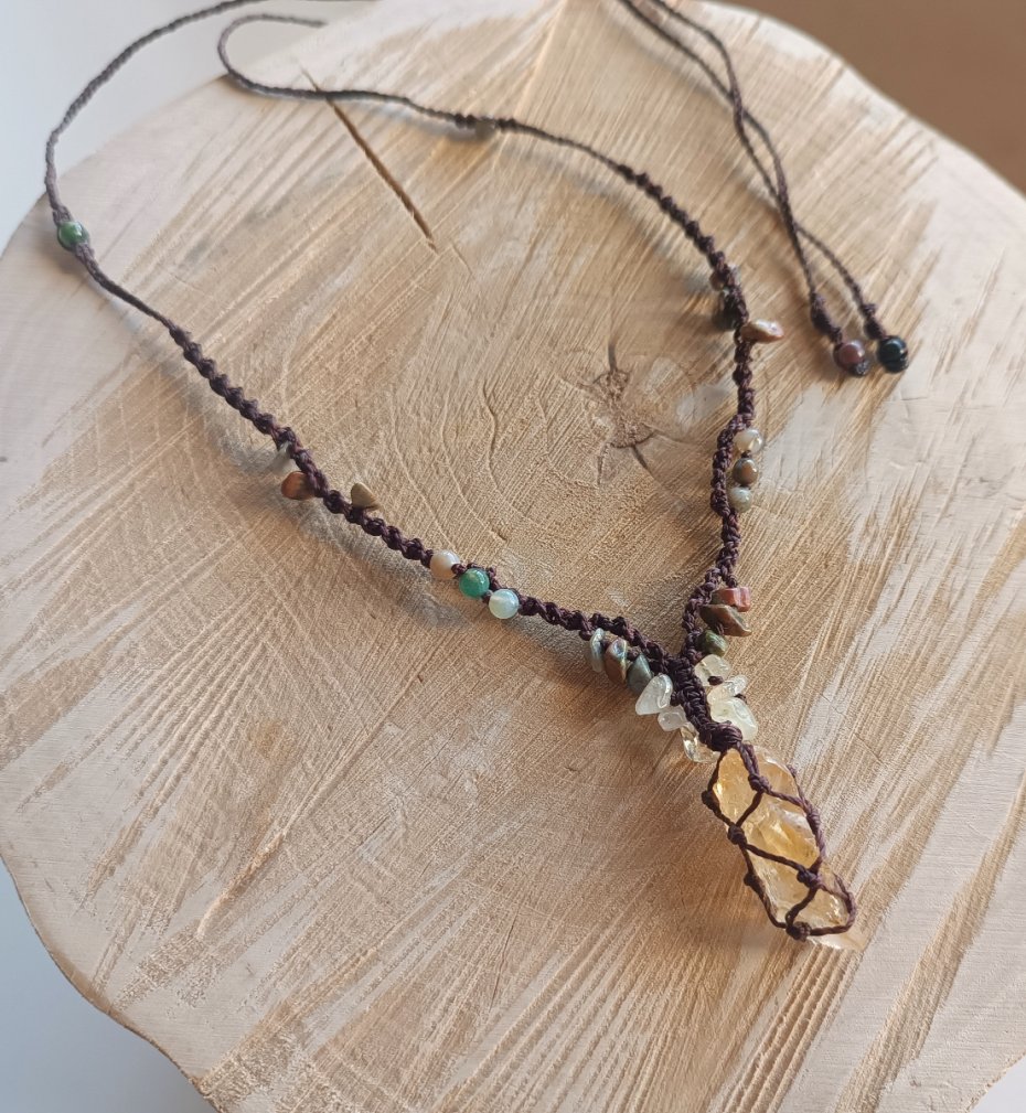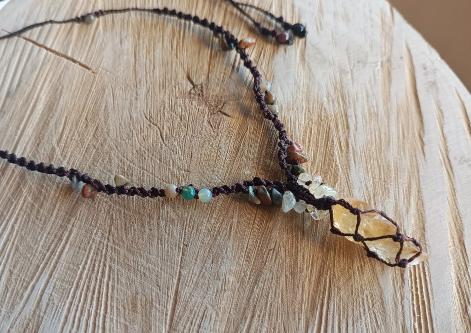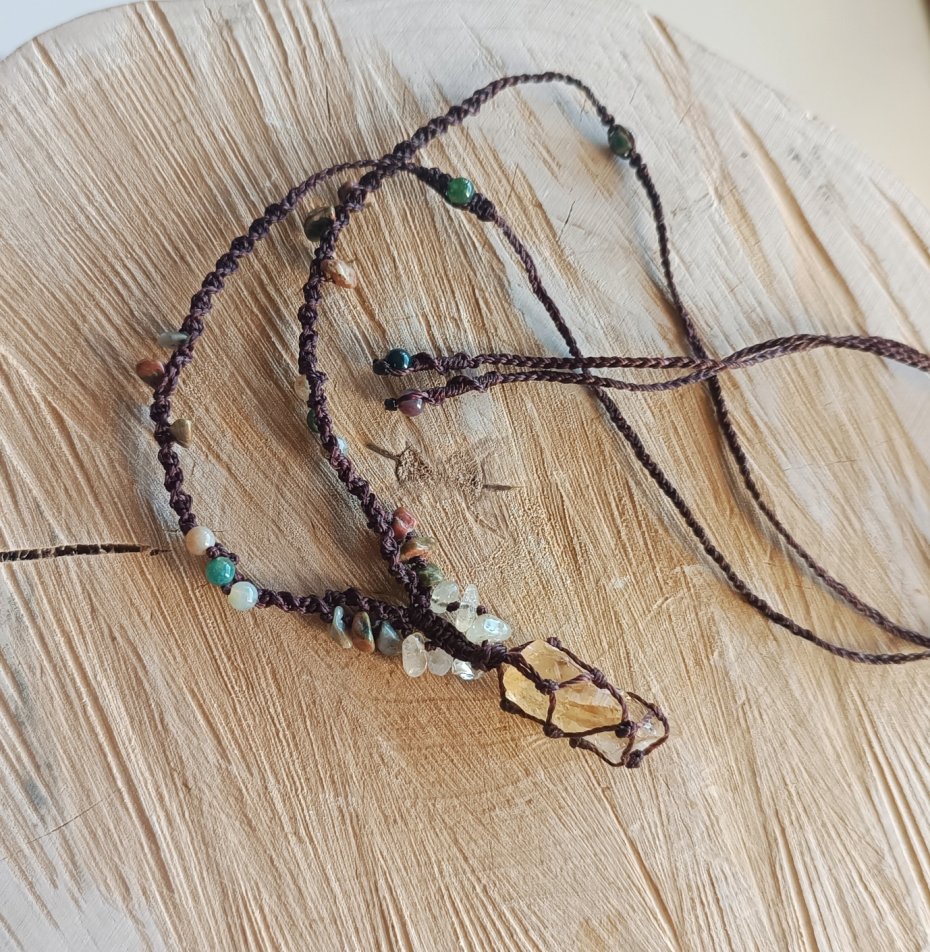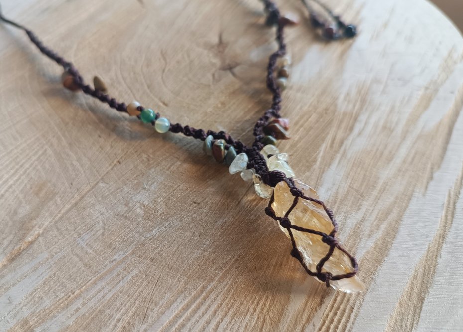 Naszyjnik z cytrynem (wielkość kamienia to 1,9/ 3 cm). Dodatkowe kamienie to niereguralne bryłki unakitu i cytrynu oraz agat indyjski (4 mm).