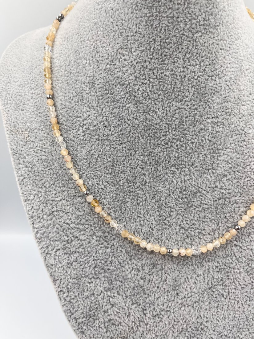 Niesamowicie delikatny i subtelny naszyjnik wykonany z cytrynu naturalnego do którego dobrałam przeźroczyste cyrkonie i hematyt w srebrnym kolorze. Naszyjnik, który pomimo swojej delikatności niesie niesamowitą moc- energetyzujący i przyciągający bogactwo i szczęście. To kamień, który stymuluje pozytywne myślenie i kreatywność.