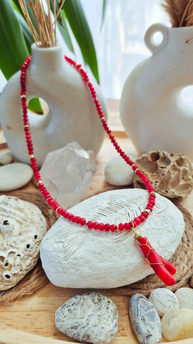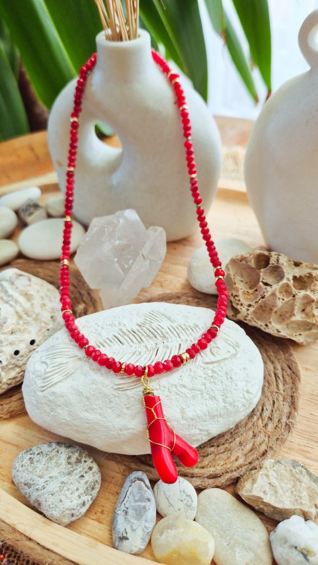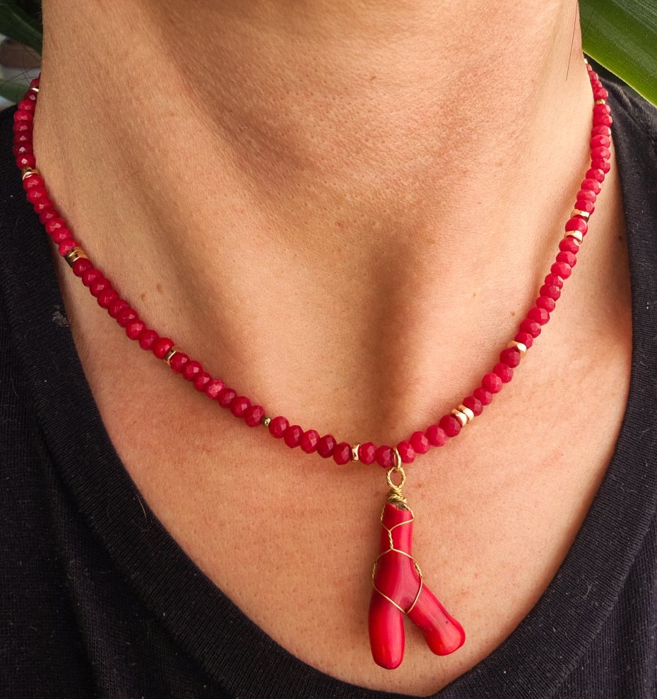 NASZYJNIK Z CZERWONYCH JADEITÓW I ZAWIESZKI Z KORALA
