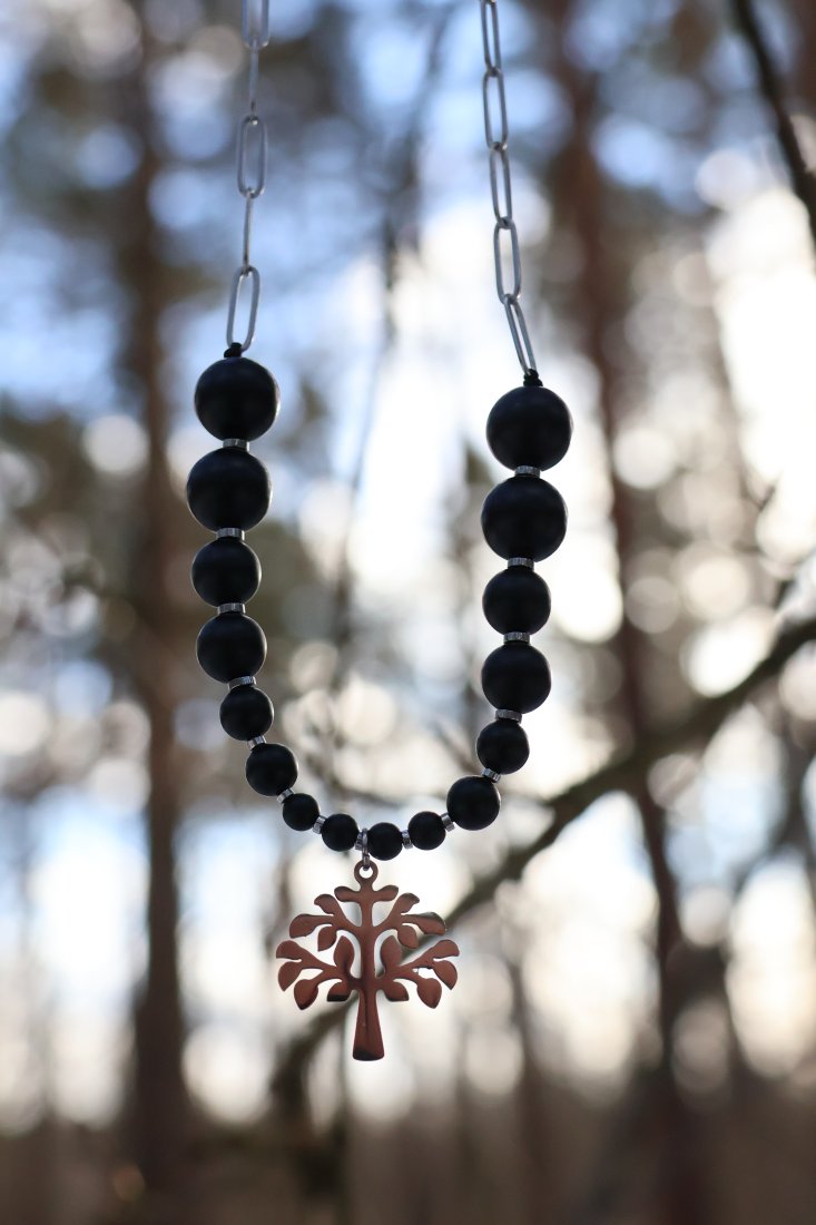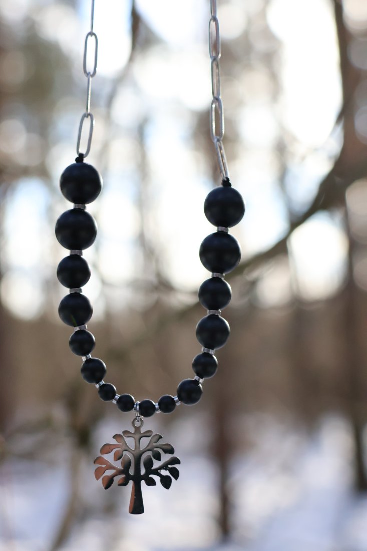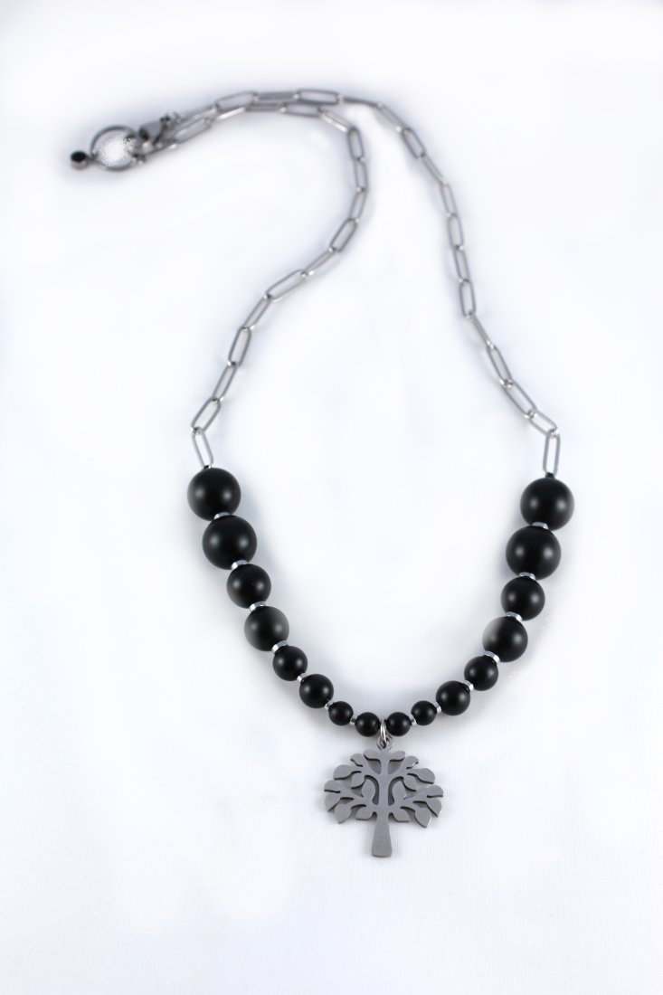 Prostoty i piękny naszyjnik z zawieszką w postaci drzewa to doskonały element stroju, który podkreśli indywidualność i klasę. Idealne, gładkie, matowe kulki onyksu o różnych wielkościach połączone z łańcuszkiem tworzą harmonijną, symetryczną ozdobę. Długość naszyjnika to 50 cm. Duży karabińczyk stanowi wygodne i łatwe do zastosowania zapięcie. Wszystkie metalowe dodatki to szlachetna stal chirurgiczna, w kolorze srebra, która nie uczula skóry.
