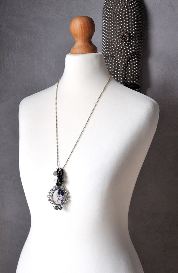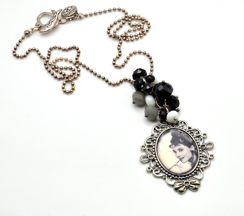 Naszyjnik wykonany z kryształków swarovski rondelle w odcieniach czerni, bieli i szarości oraz ozdobnej zawieszki ze zdjęciem Audrey Hepburn w Roli Holly Golightly ze "Śniadania u Tiffany'ego".