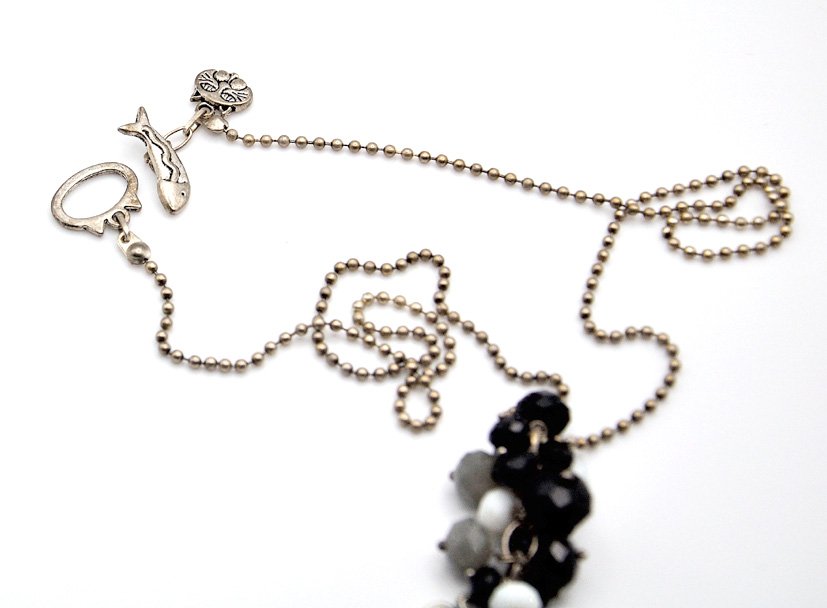 Zawieszony na łańcuszku kulkowym z uroczym "kocim" zapięciem typu bali. Wszystkie elementy metalowe w odcieniu starego srebra.
