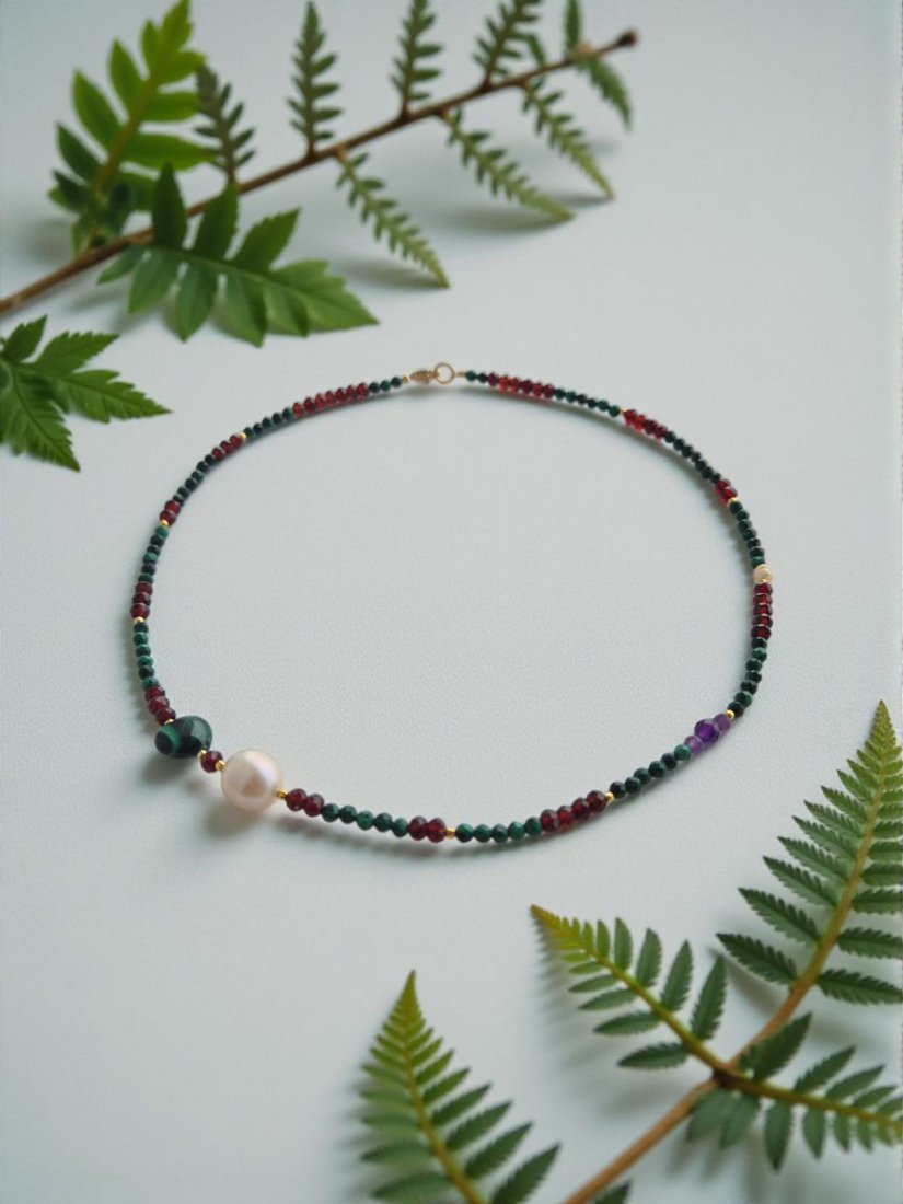 Naszyjnik z kamieni naturalnych granatów,malachitów,ametystu i perły naturalnej