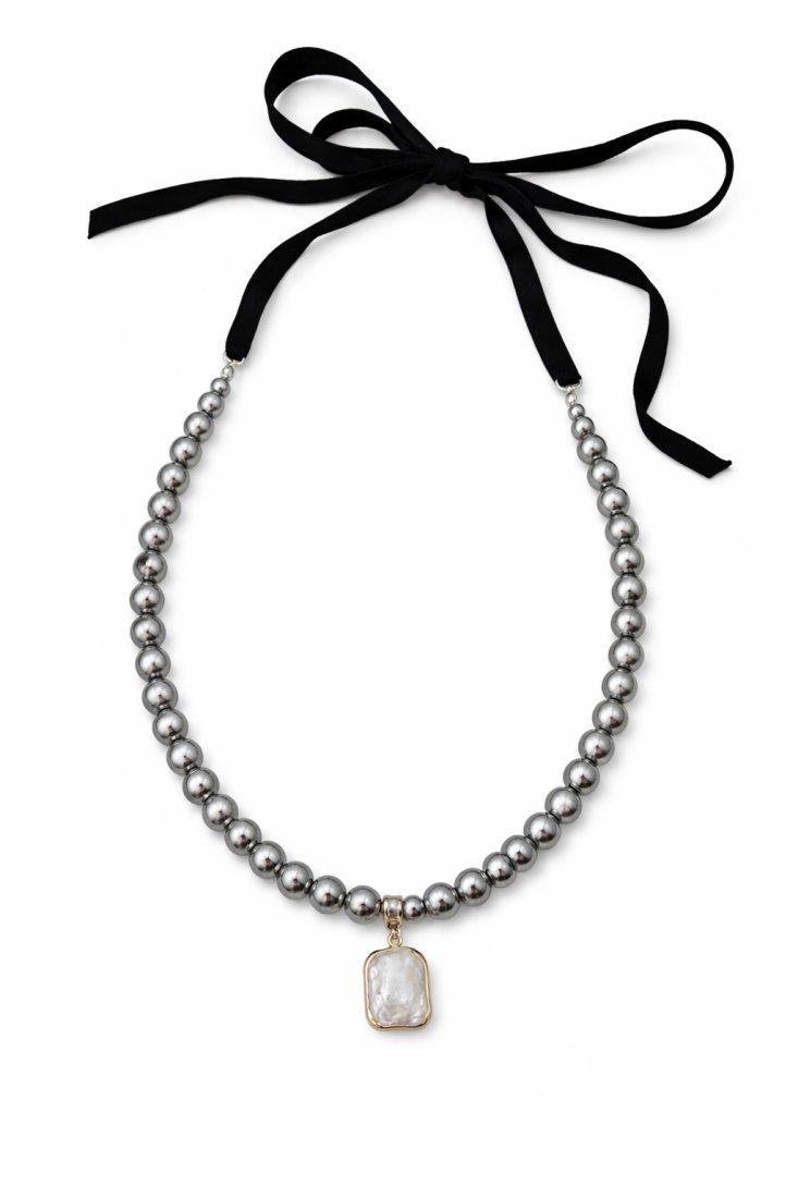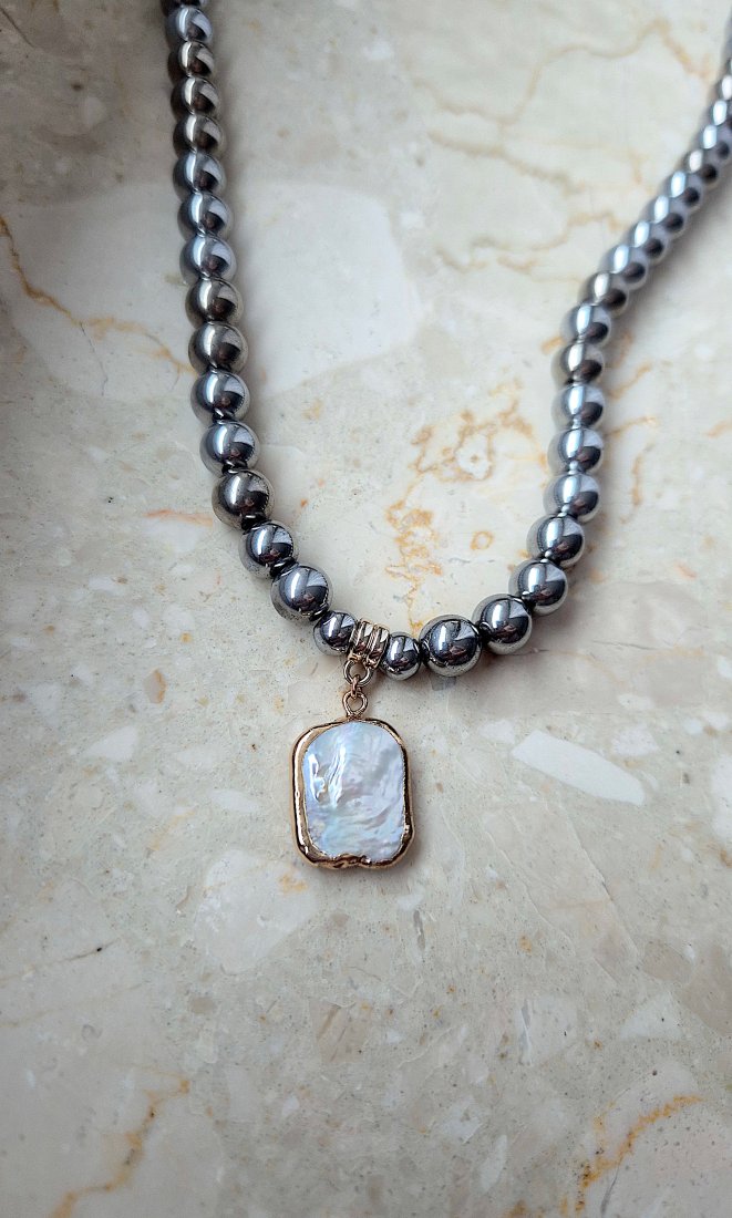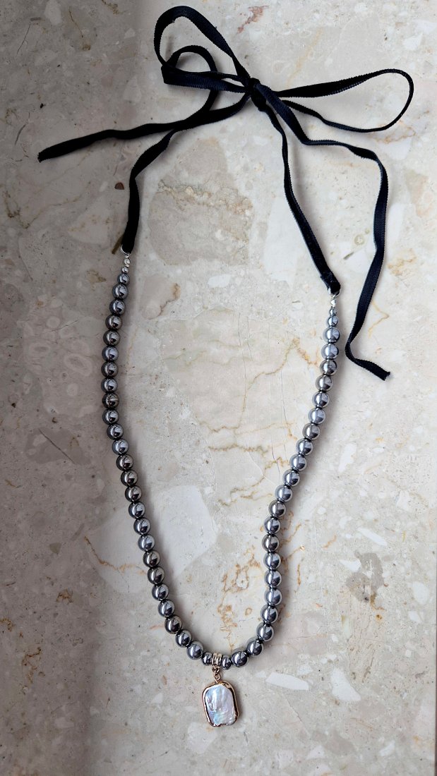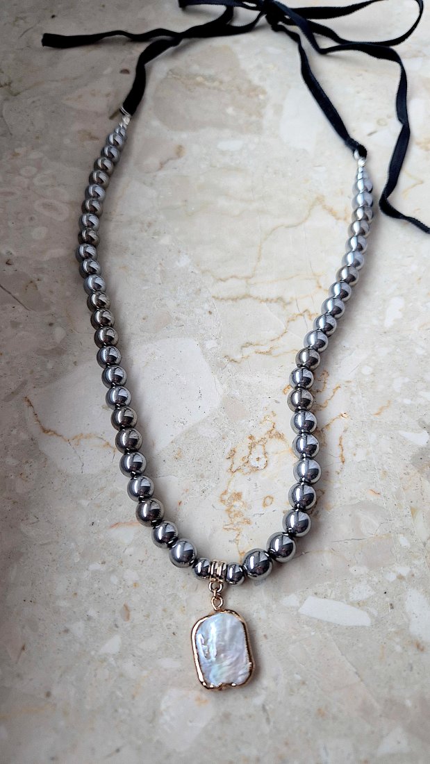 Tagi: #naszyjnik z hematytu, #naszyjnik z kamieni, #naszyjnik z kokardką, #perły
