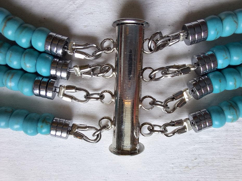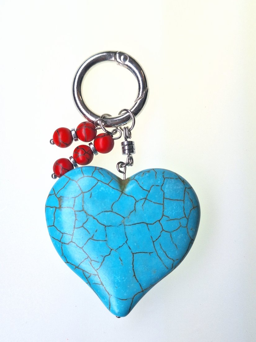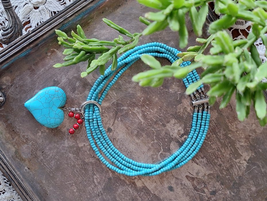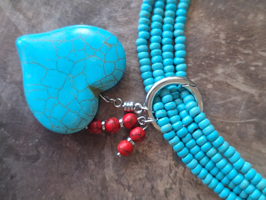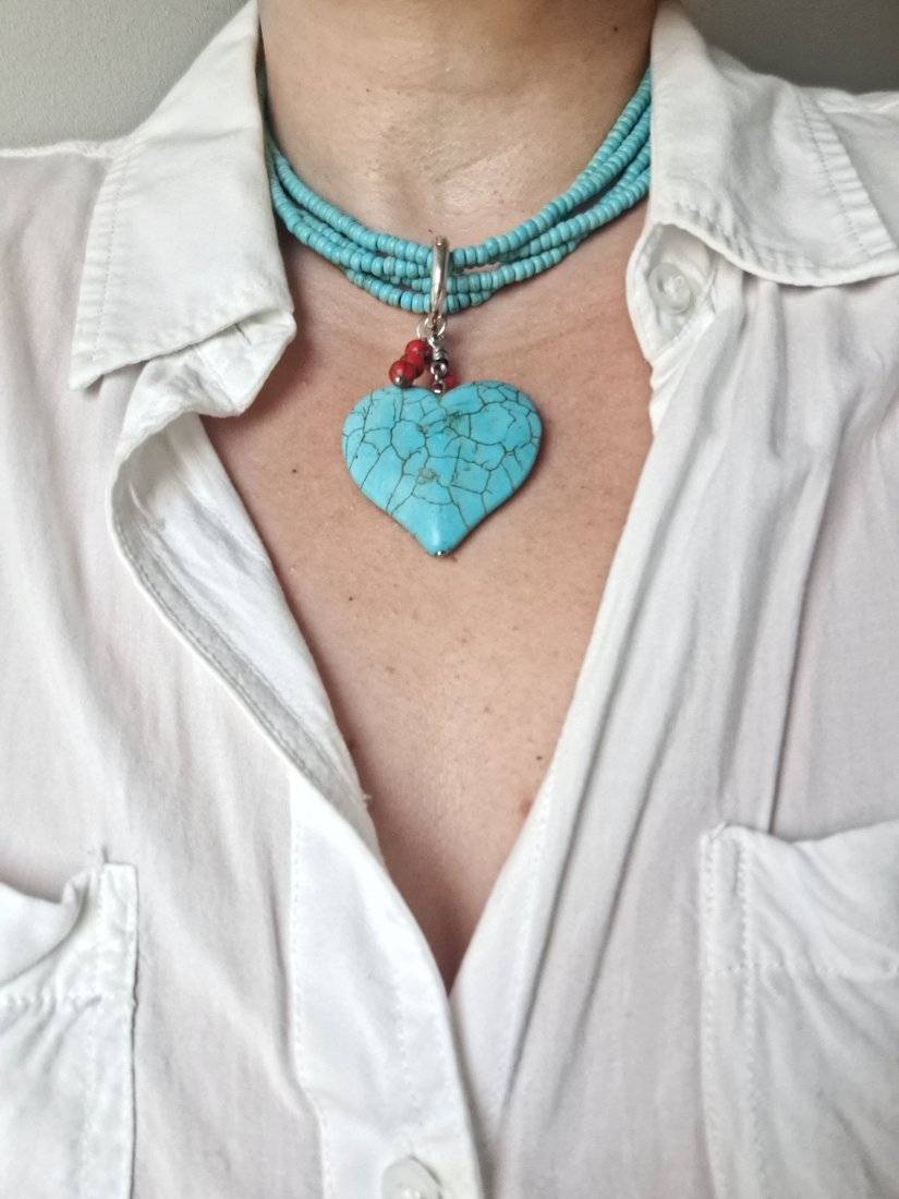 Niebieski howlit, cztery sznury kamienia z zawieszką Serce, także z howlitu. Zawieszkę można zdjąć i nosić sam naszyjnik, lub zawieszkę jako brelok na czymś innym.