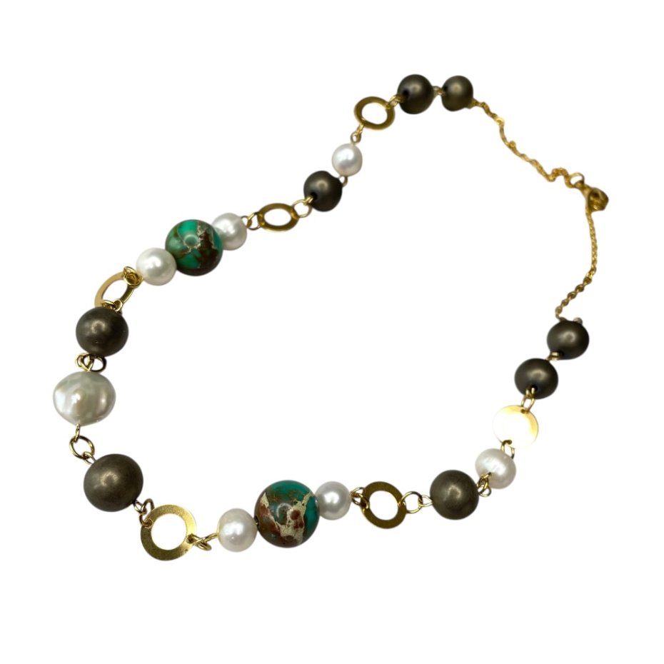 Perłowy naszyjnik z jaspisem i hematytem to połączenie klasyki z nowoczesnym wykończeniem. Naturalne perły zestawione z jaspisem cesarskim tworzą elegancką, harmonijną bazę, którą uzupełnia grafitowy połysk hematytu, dodający całości świeżości i delikatnie industrialnego wyrazu. Całość spinają okrągłe ogniwa, wprowadzając spójny, uporządkowany rytm o minimalistycznym charakterze. To propozycja dla osób, które cenią biżuterię łączącą tradycyjne materiały z nowoczesną formą.