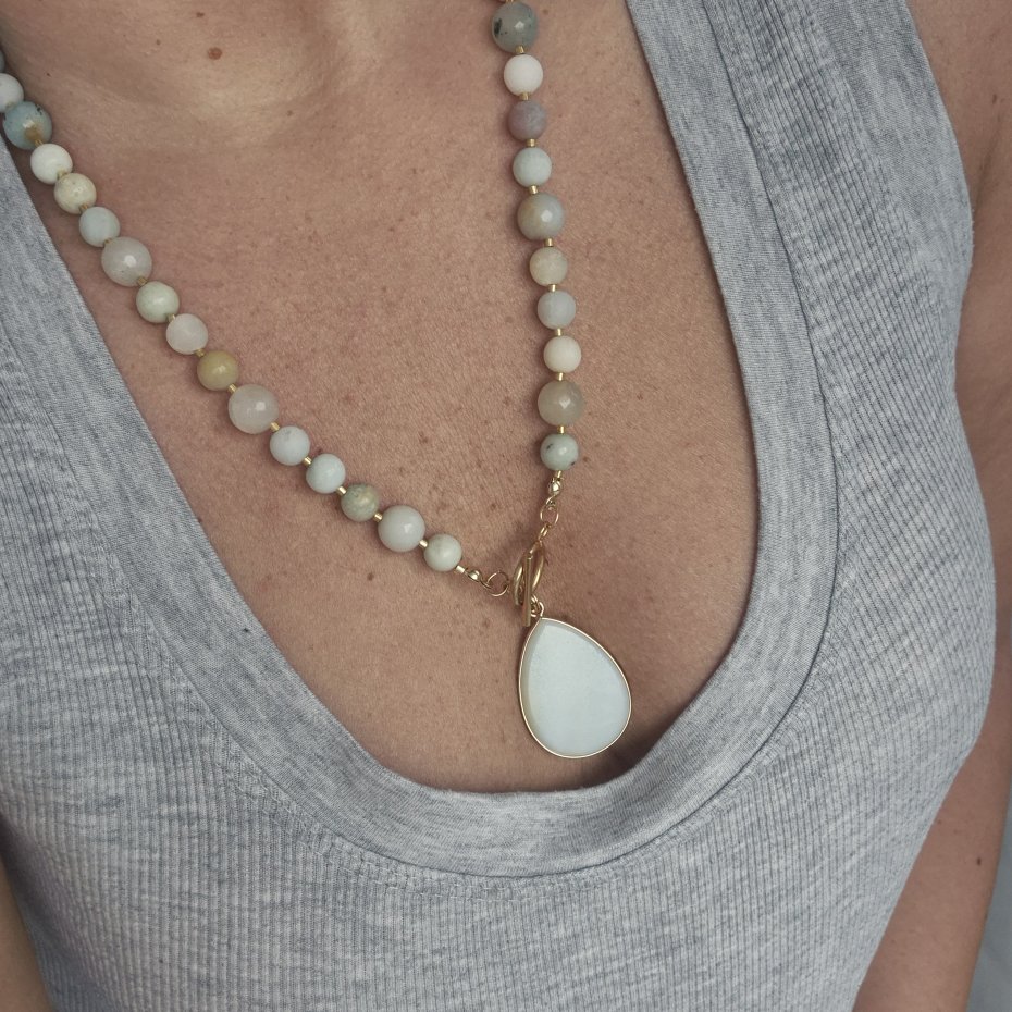 Kamienie użyte w naszyjniku to amazonit i jadeit, zarówno o matowym wykończeniu jak i błyszczącym, gładkie i fasetowane. Pomiędzy kamieniami znajdują się szklane koraliki. Poszczególne kombinacje mogą się minimalnie różnić od siebie, co jest naturalne dla kamieni naturalnych- nie ma dwóch identycznych.