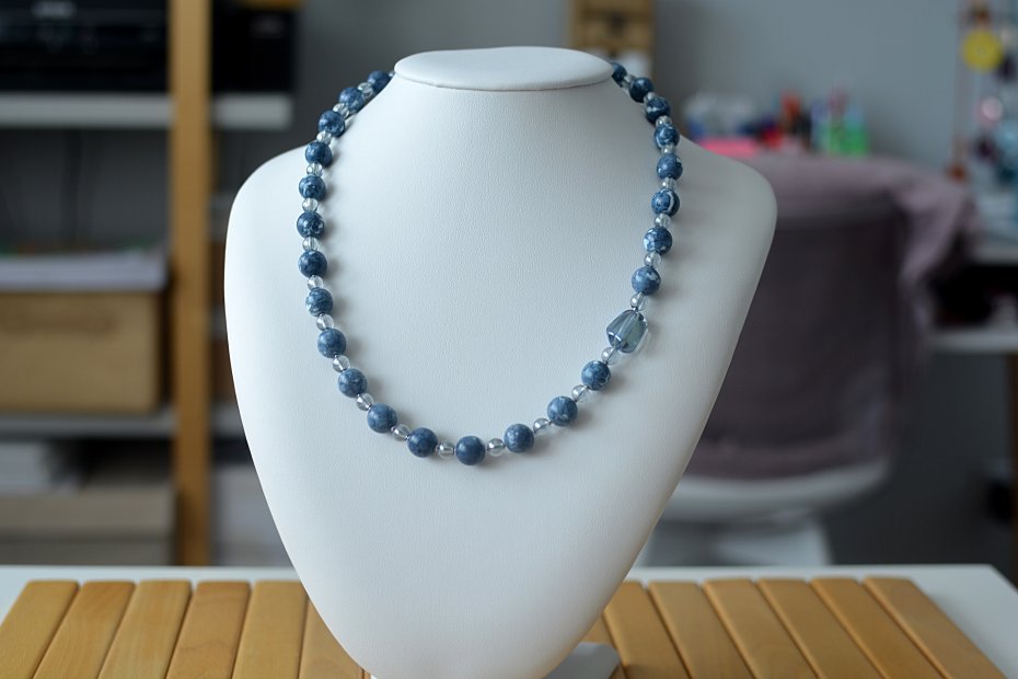 Naszyjnik wykonany z kulek jadeitów (śr.10mm), kulek kryształu górskiego (śr.6mm), nieregularnej bryłki kryształu (18x12mm) oraz przekładkowych kuleczek ze stali szlachetnej.
