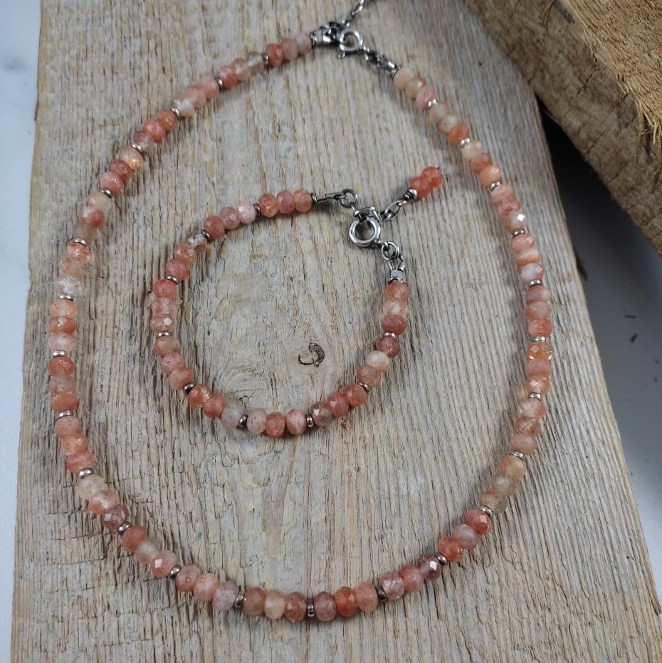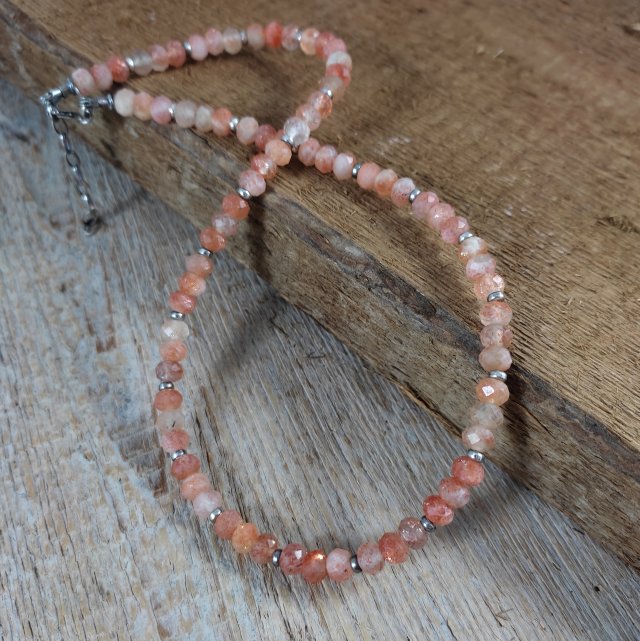 Naszyjnik wykonany z fasetowanych oponek kamienia słonecznego ok. 6 mm. Całość dopełniona srebrem 925, oksydowanym i wypolerowanym. Długość naszyjnika wynosi ok. 40 cm, plus łańcuszek regulacyjny 4 cm. Elegancko zapakowany.