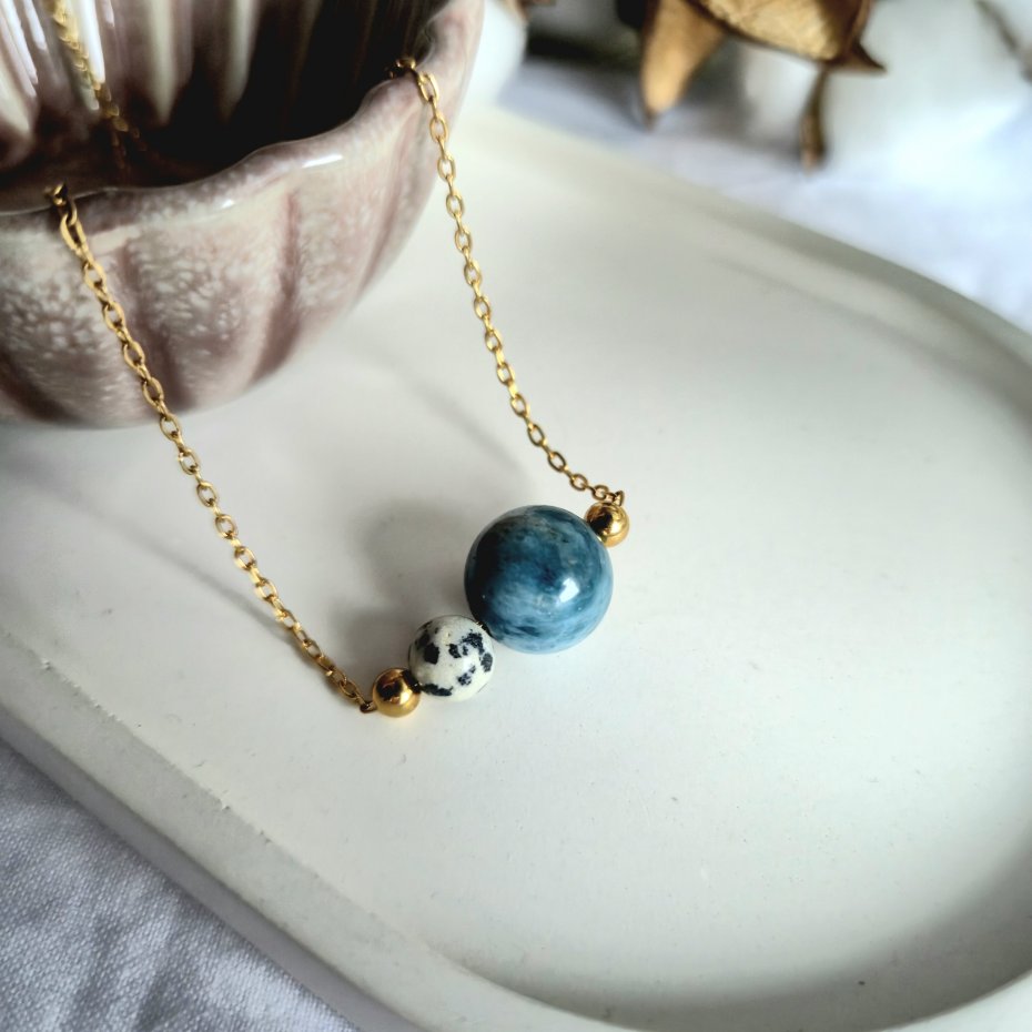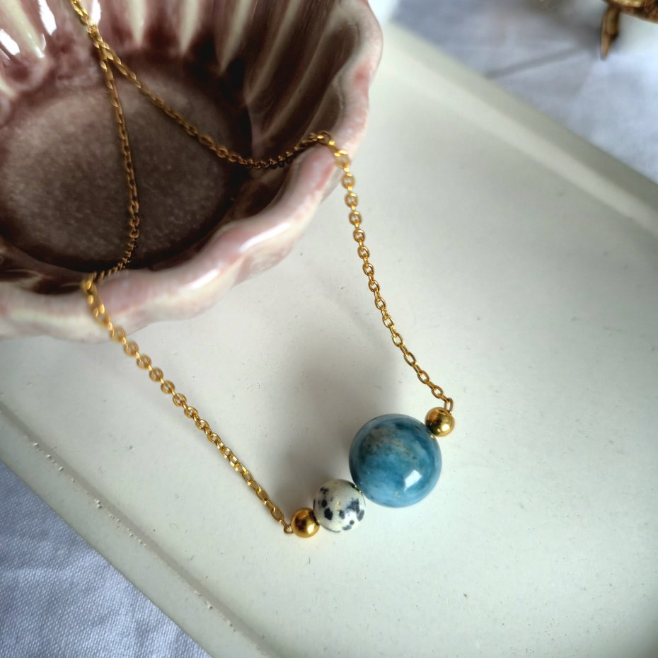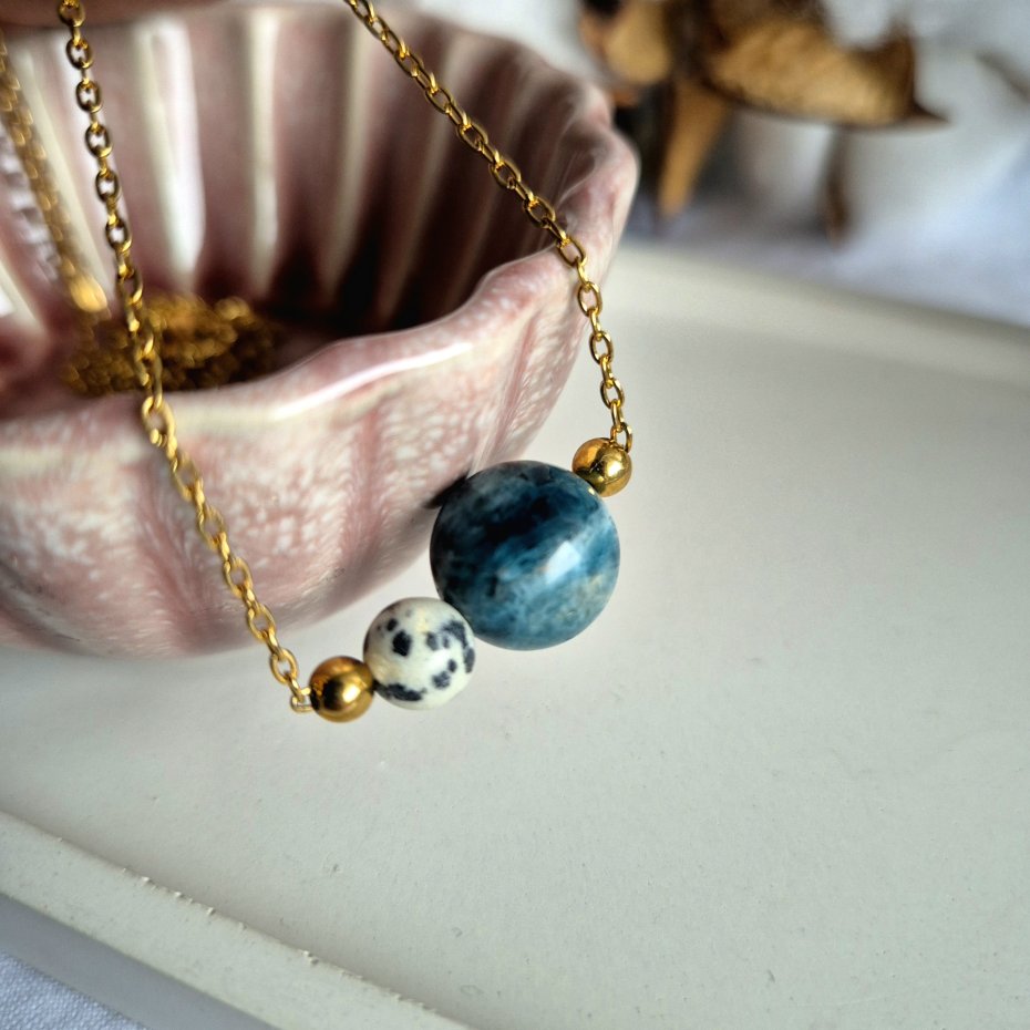 Unikatowy naszyjnik ze stali szlachetnej w złotym kolorze z zawieszką z kamieni naturalnych- z apatytu i jaspisu dalmatyńskiego oraz kuleczek ze stali w złotym kolorze.