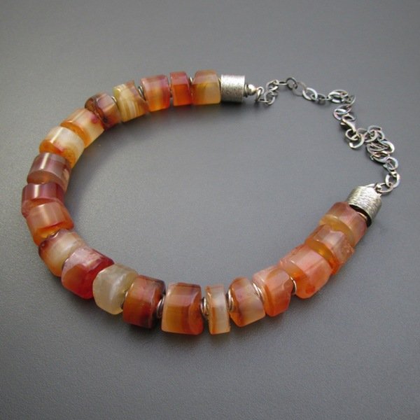 Naszyjnik wykonany z surowych oponek karneolu 12 mm, które posiadają przeważnie jedną stronę surową drugą ciętą. Całość dopełnia srebro 925, oksydowane i wypolerowane, w tym satynowe walce. Długość naszyjnika wynosi ok. 42,5 cm, w tym kamienie stanowią ok. 24 cm. Elegancko zapakowany.