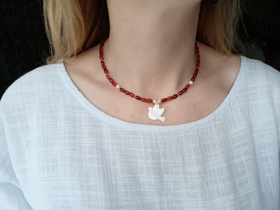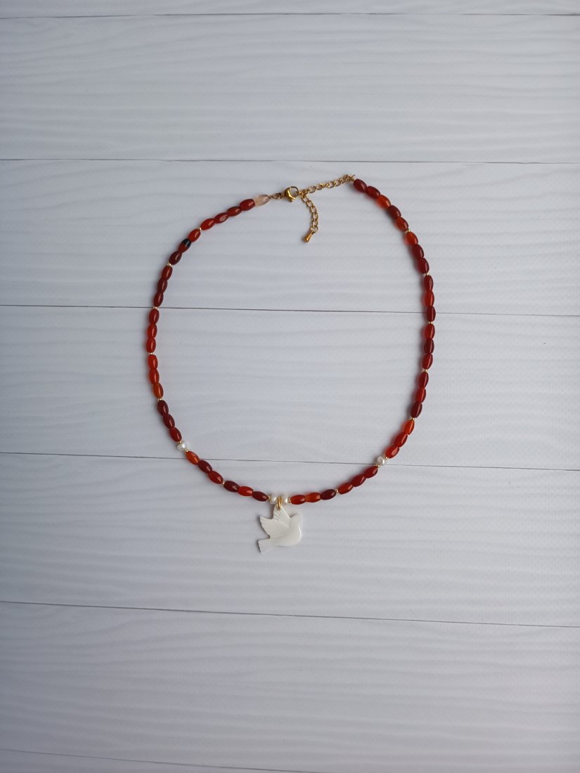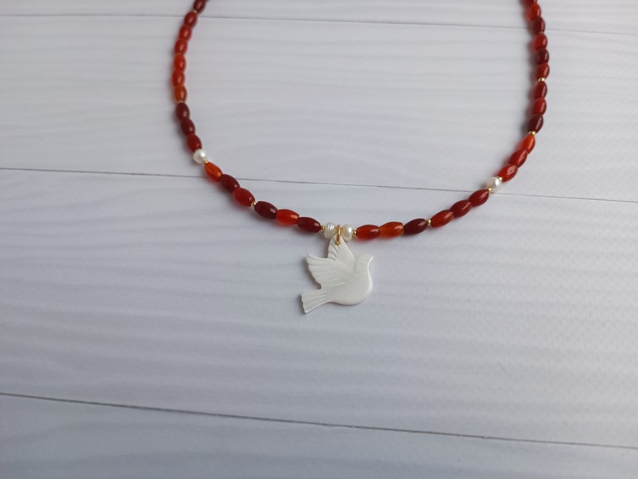 Naszyjnik z karneolu z ptakiem z masy perłowej. Regulowana długość.