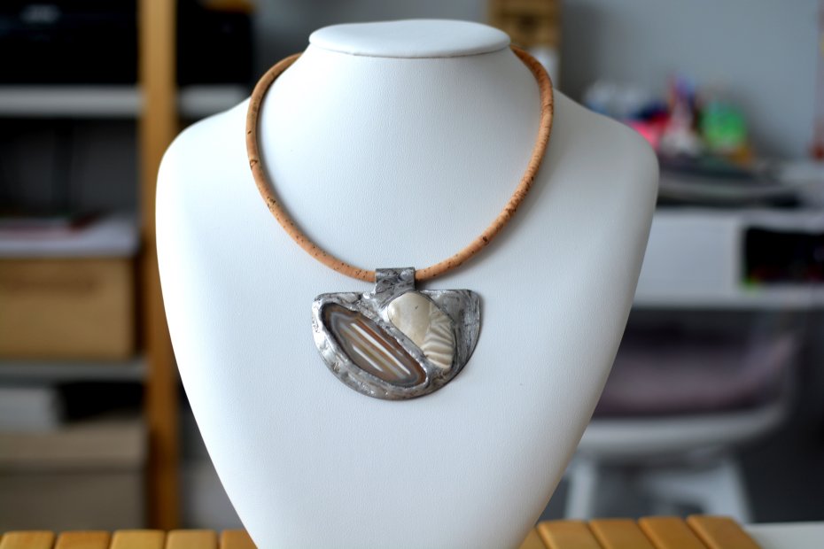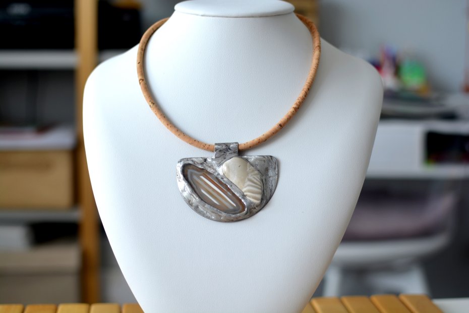 Wisior został zawieszony na korkowym rzemieniu, mających długość ok. 50cm (+ 5 cm łańcuszka regulacyjnego). Sam naszyjnik de facto będzie nieco krótszy ze względu na szerokie, tunelowe osadzenie wisiora.