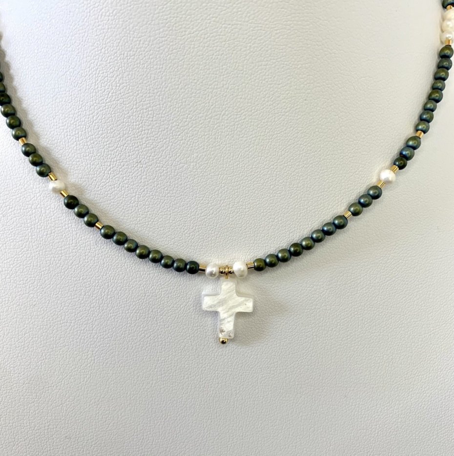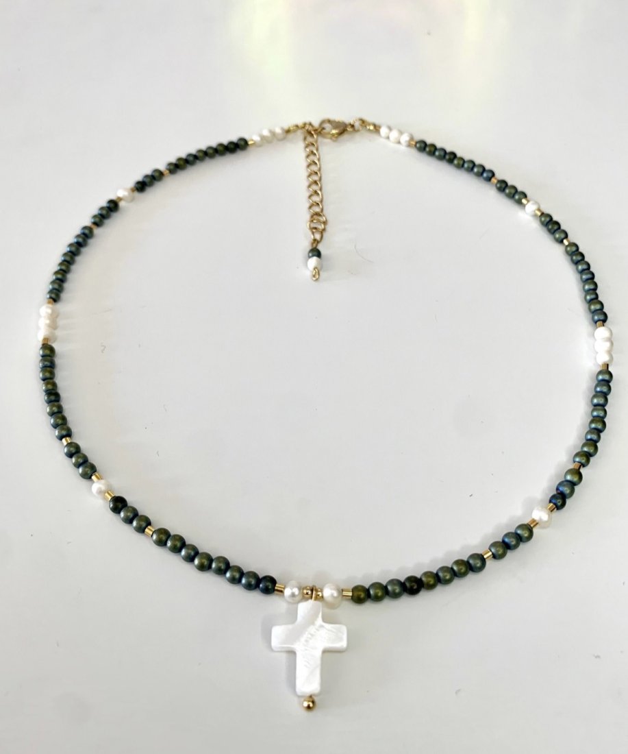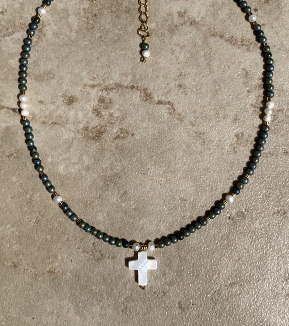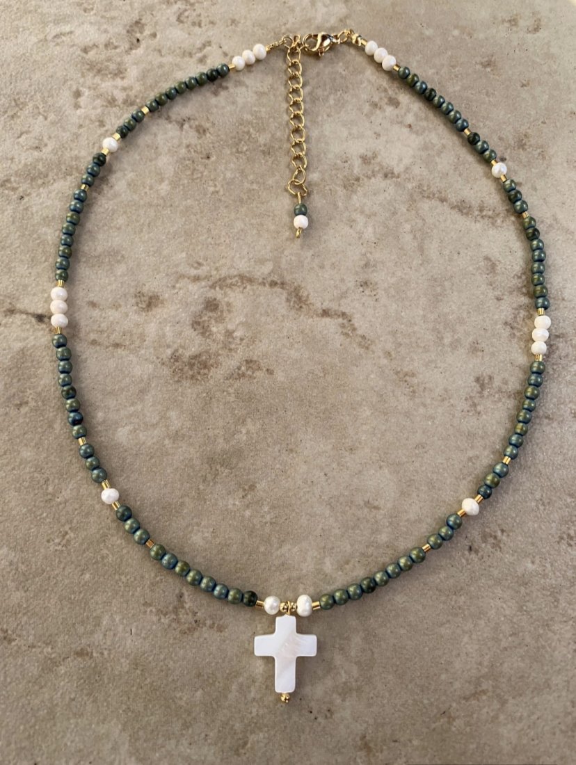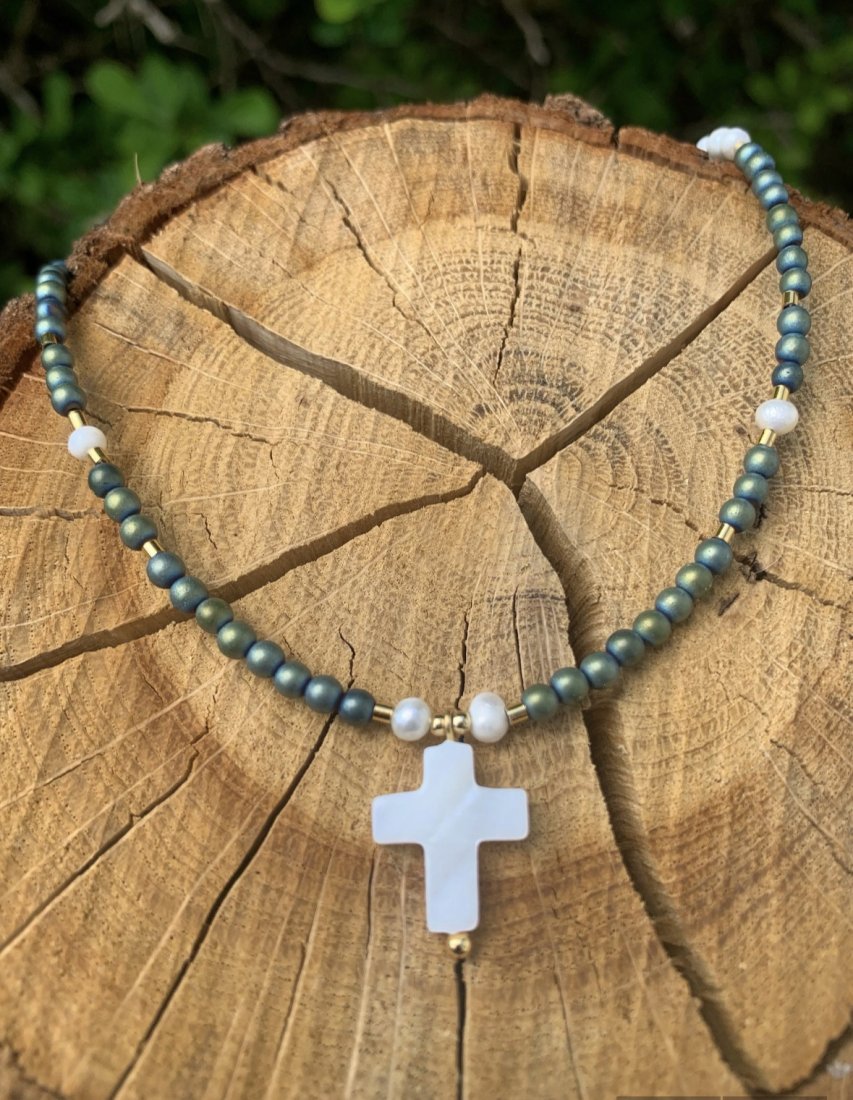Piękny ponadczasowy naszyjnik wykonany z zielono-niebieskich hematytów o perłowym połysku połączonych z malutkimi perełkami słodkowodnymi i pozłacanymi hematytami. Krzyżyk z naturalnej masy perłowej,