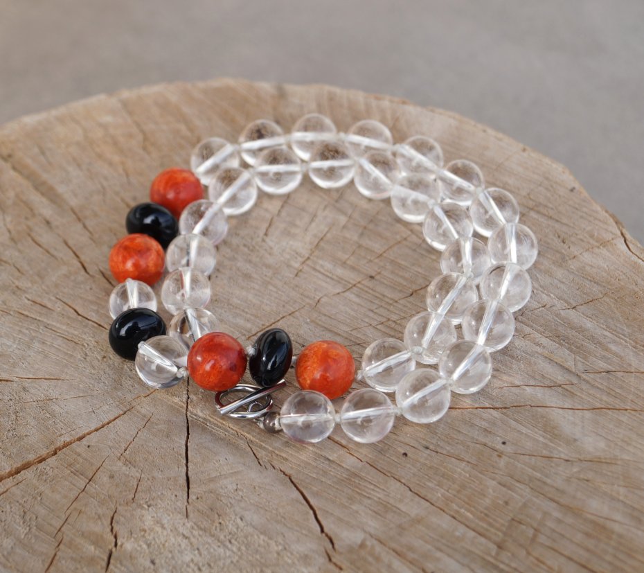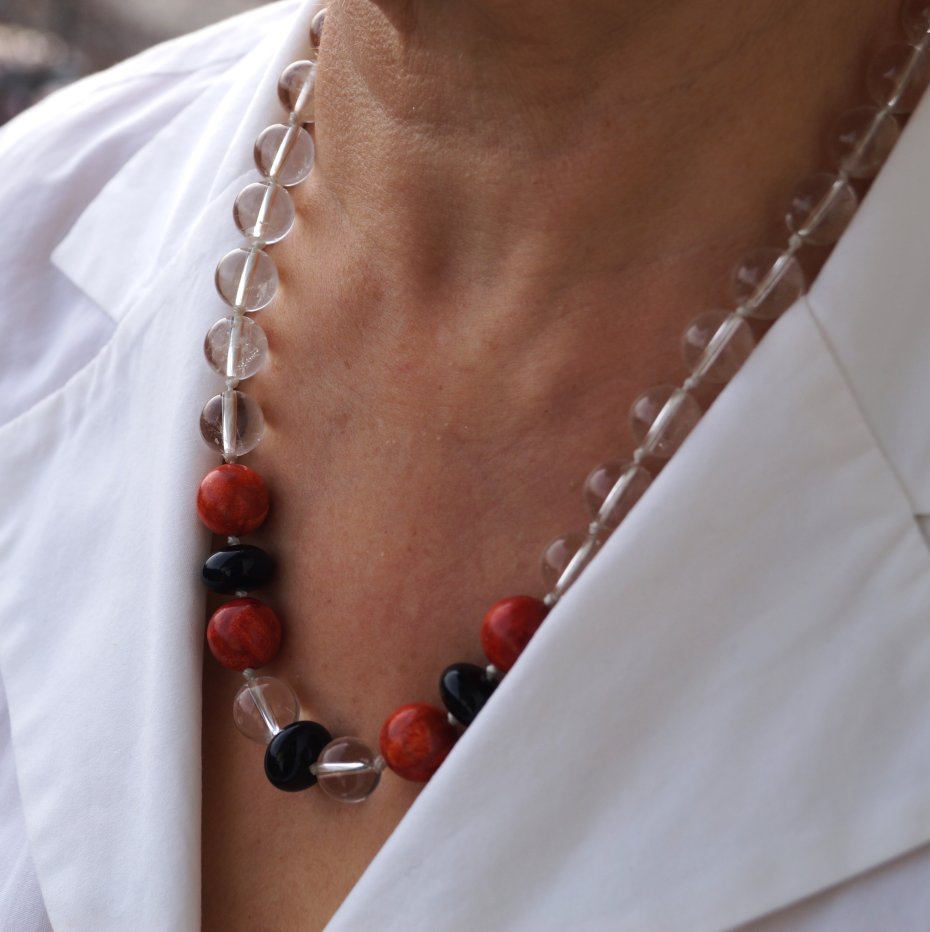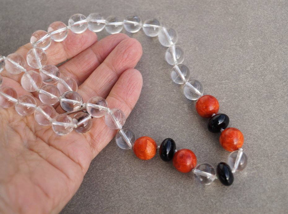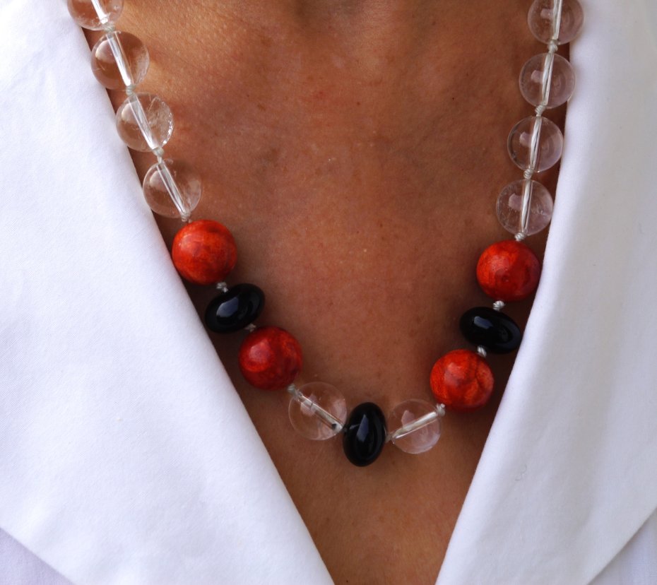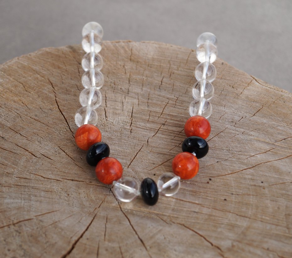 Elegancki naszyjnik wykonany z naturalnych kamieni: kwarcu 12 mm, korala 14 mm oraz oponek z onyksu 14 mm. Każda kulka została starannie oddzielona supełkiem, co podkreśla kunszt ręcznego wykonania, zwiększa trwałość i dodaje biżuterii ekskluzywnego charakteru.