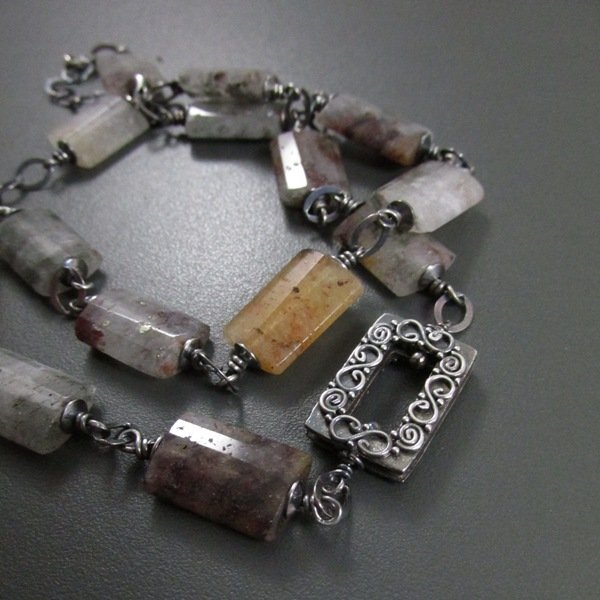 Naszyjnik wykonany z prostokątów kwarcu z rutylem 10/15 mm. Całość wykończona w srebrze 925, oksydowanym i wypolerowanym, w tym prostokąt, element bali 12/18 mm. Długość naszyjnika wynosi ok. 46 cm, plus łańcuszek regulacyjny 5 cm. Elegancko zapakowany.