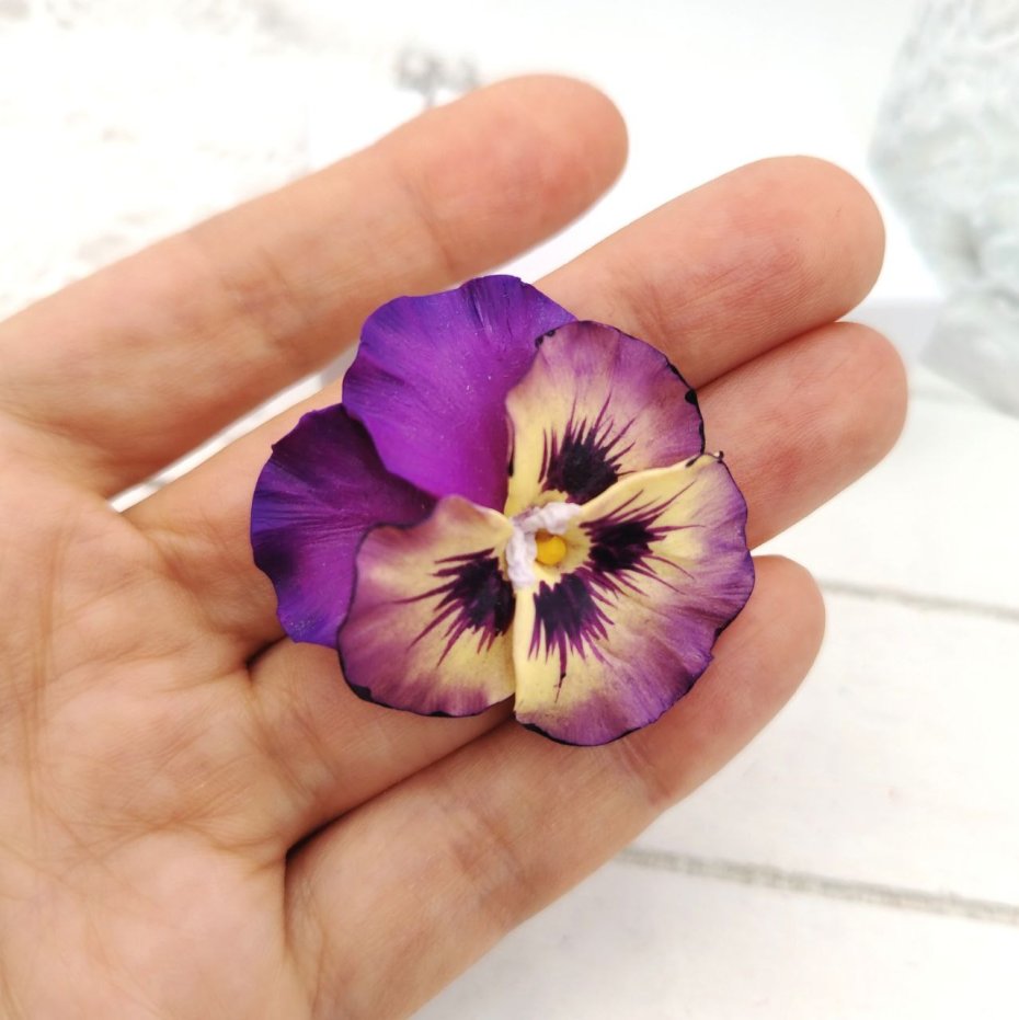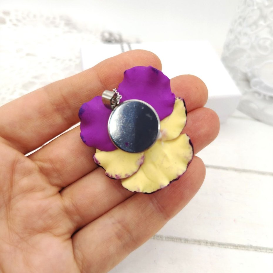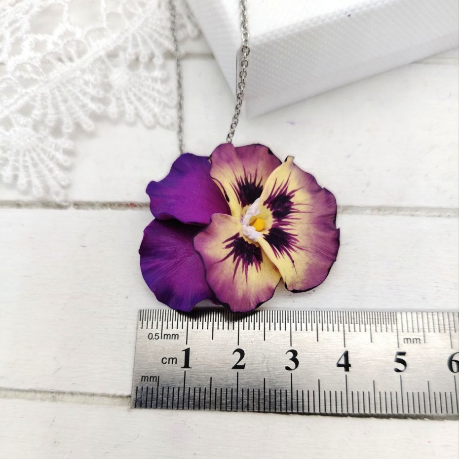 Ręcznie wykonany naszyjnik z uroczym kwiatem bratka o wysokości około 4 cm.