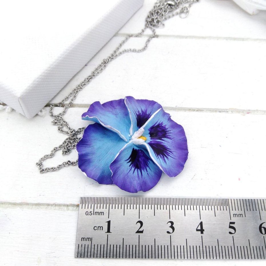 Ręcznie wykonany naszyjnik z uroczym kwiatem bratka o wysokości około 4 cm.