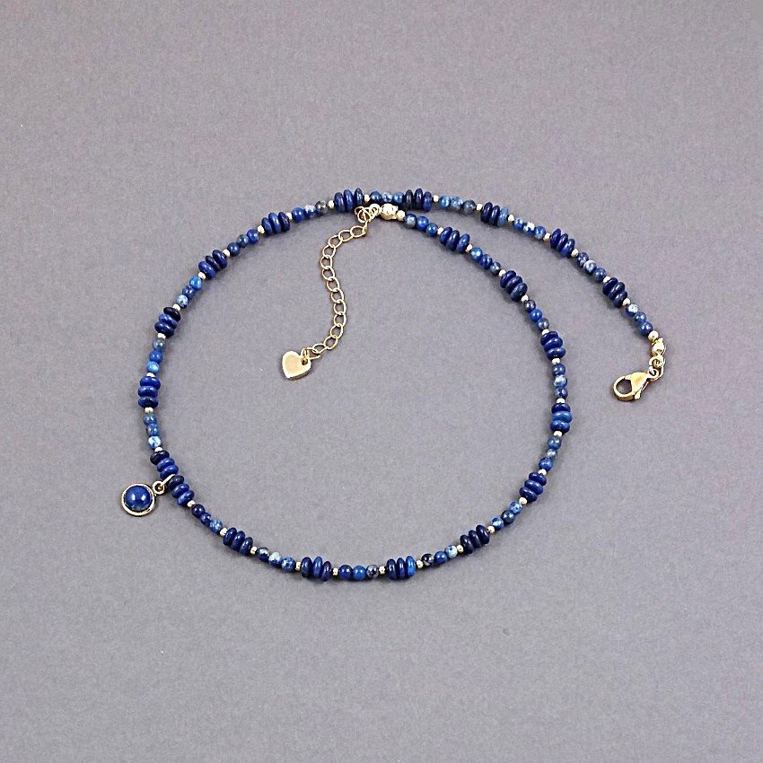 Wykończenie z nieuczulającej, pozłacanej stali szlachetnej. Malutka zawieszka to kaboszon z lapis lazuli oprawiony w stal. Zawieszka ma średnicę 7mm.