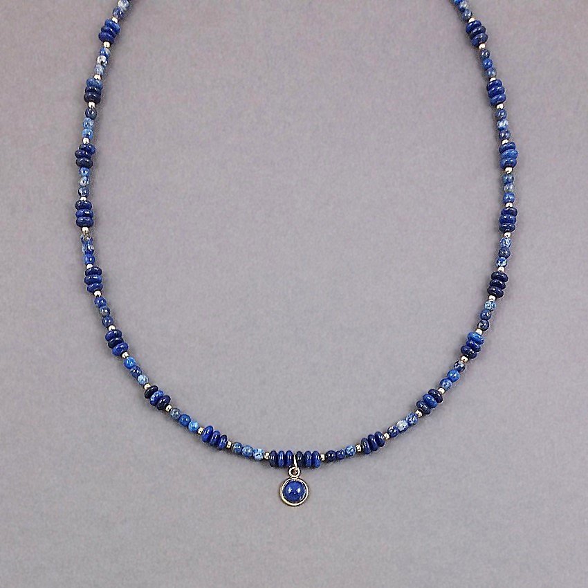 Krótki naszyjnik z gładkich oponek lapis lazuli, o średnicy 4mm i kuleczek sodalitu, o średnicy 3mm.
