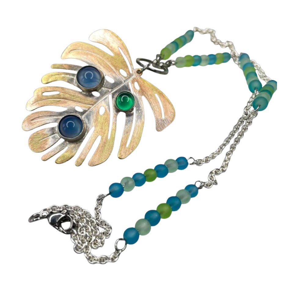 Naszyjnik z motywem liścia monstery, agatami i matowym szkłem to propozycja, w której artystyczna forma spotyka się z naturalnym pięknem kamieni. Miejscowo posrebrzany mosiądz stanowi elegancką bazę dla agatów w odcieniach zieleni i błękitu, przywołujących skojarzenia z tropikalną roślinnością i spokojem natury. Subtelne, matowe koraliki ze szkła wprowadzają lekkość i miękkość, podkreślając grę faktur i kolorów. Całość tworzy wyważoną, a zarazem wyrazistą kompozycję - idealną dla kobiet, które lubią biżuterię z charakterem, łączącą ponadczasową elegancję z artystyczną swobodą.