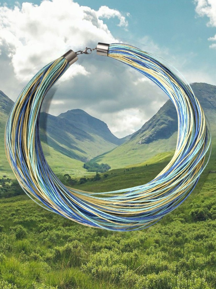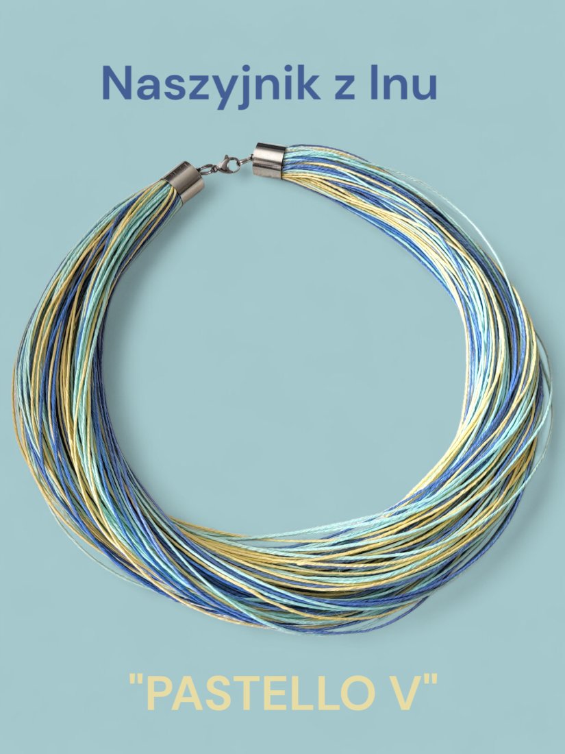 Wielobarwny naszyjnik wykonany z wyprodukowanego w Polsce, wysokogatunkowego lnu. Sznureczki lniane są w kolorach: niebieskim, mietowym i żółtym. Naszyjnik został wykończony elementami metalowymi w kolorze stalowym, a zapinany jest na karabińczyk.