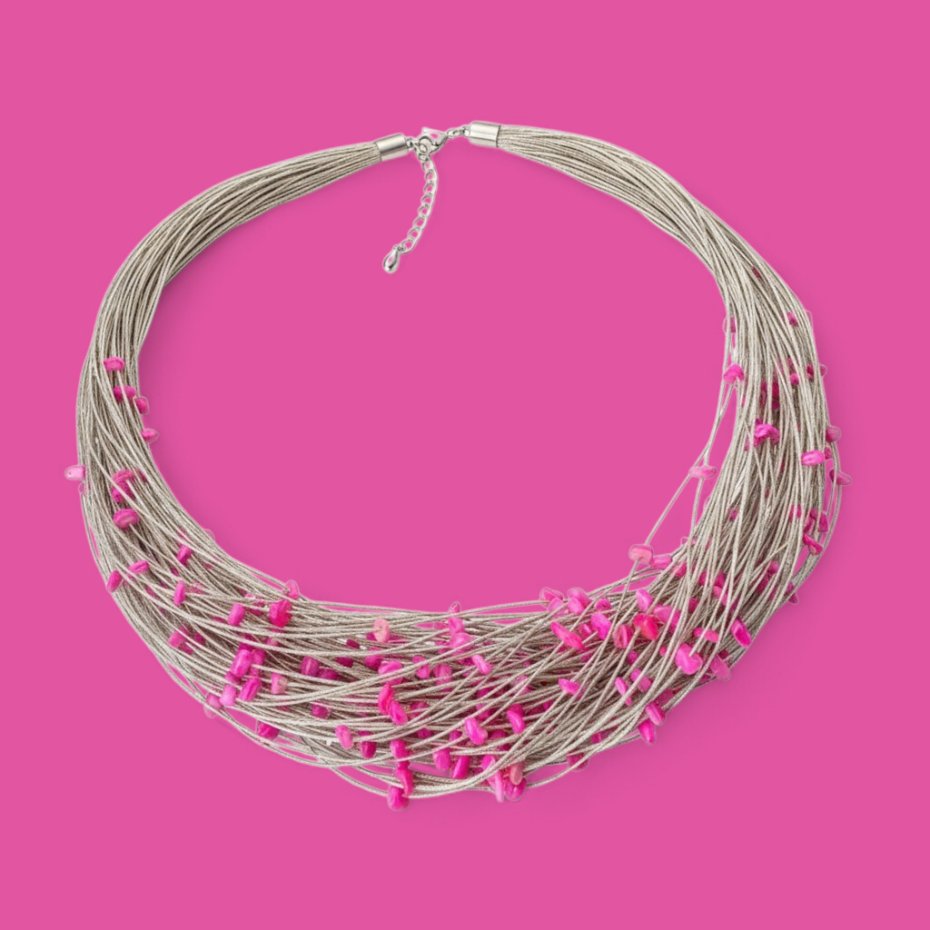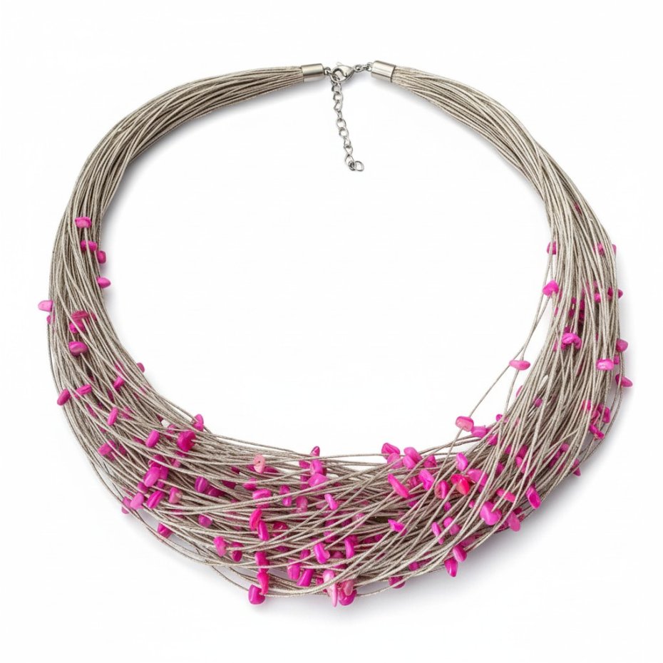 Naszyjnik wykonany z wyprodukowanego w Polsce, wysokogatunkowego lnu w kolorze naturalnym oraz dużej ilości bryłek różowej masy perłowej. Stosowane przez nas nici lniane są nabłyszczane, co oznacza, że mają powłokę, która sprawia, że nić jest sztywniejsza, wytrzymalsza oraz nie absorbuje tak wody. Naszyjnik został wykończony elementami metalowymi ze stali szlachetnej a zapinany jest na karabińczyk.