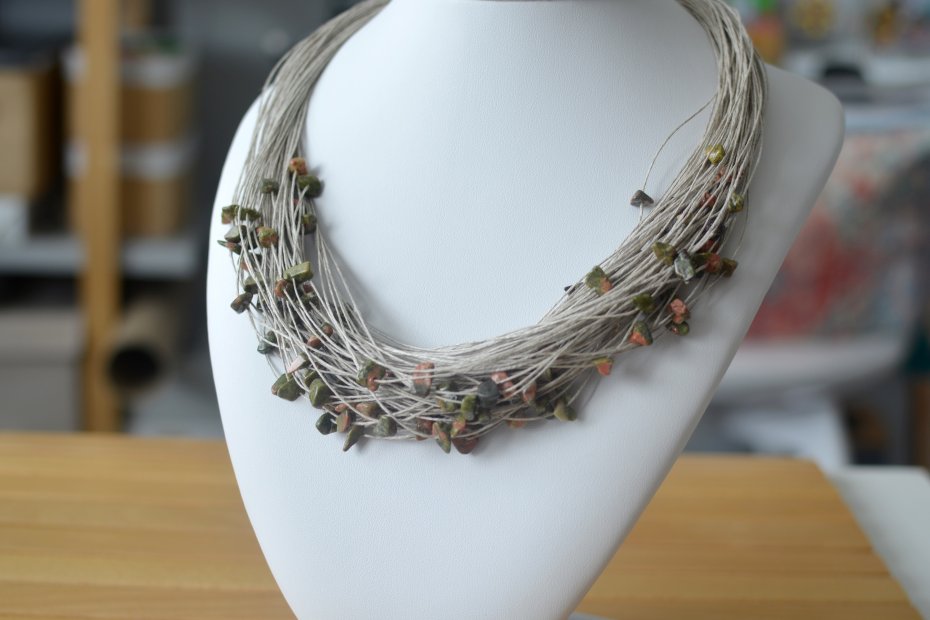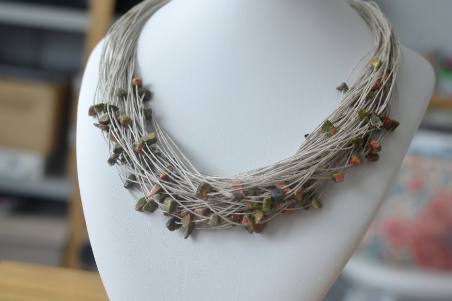 Tagi: #kamienie półszlachetne na lnie, #lniany naszyjnik, #naszyjnik z lnu, #unakit