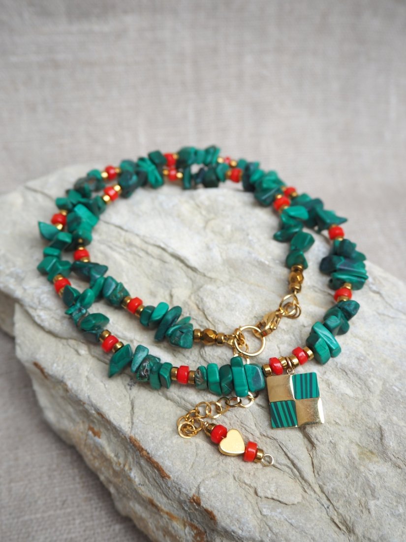 Malachit i koral tworzą harmonijne połączenie barw i energii – zieleń równoważy, a czerwień dodaje mocy i pewności siebie. Każdy egzemplarz to unikatowa biżuteria handmade w stylu vintage i boho, powstała w małej pracowni DomilkowyDomek.