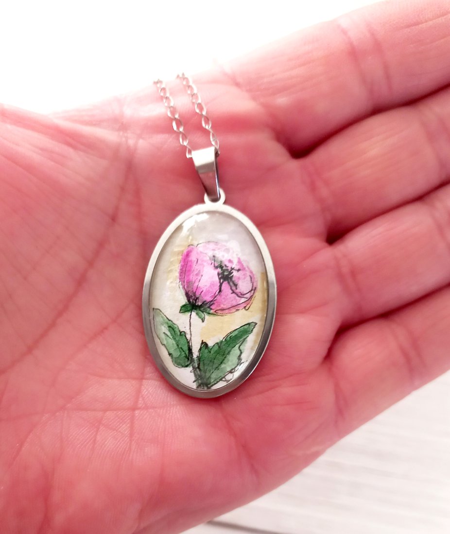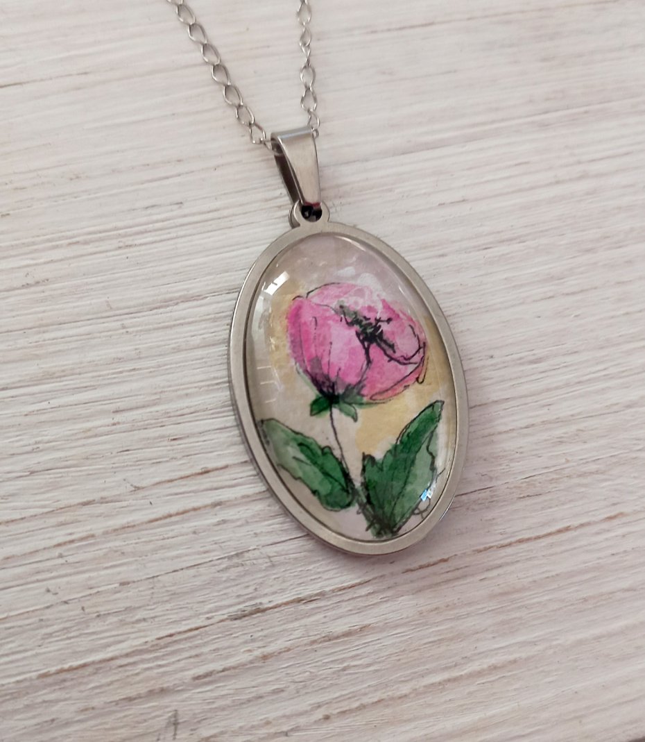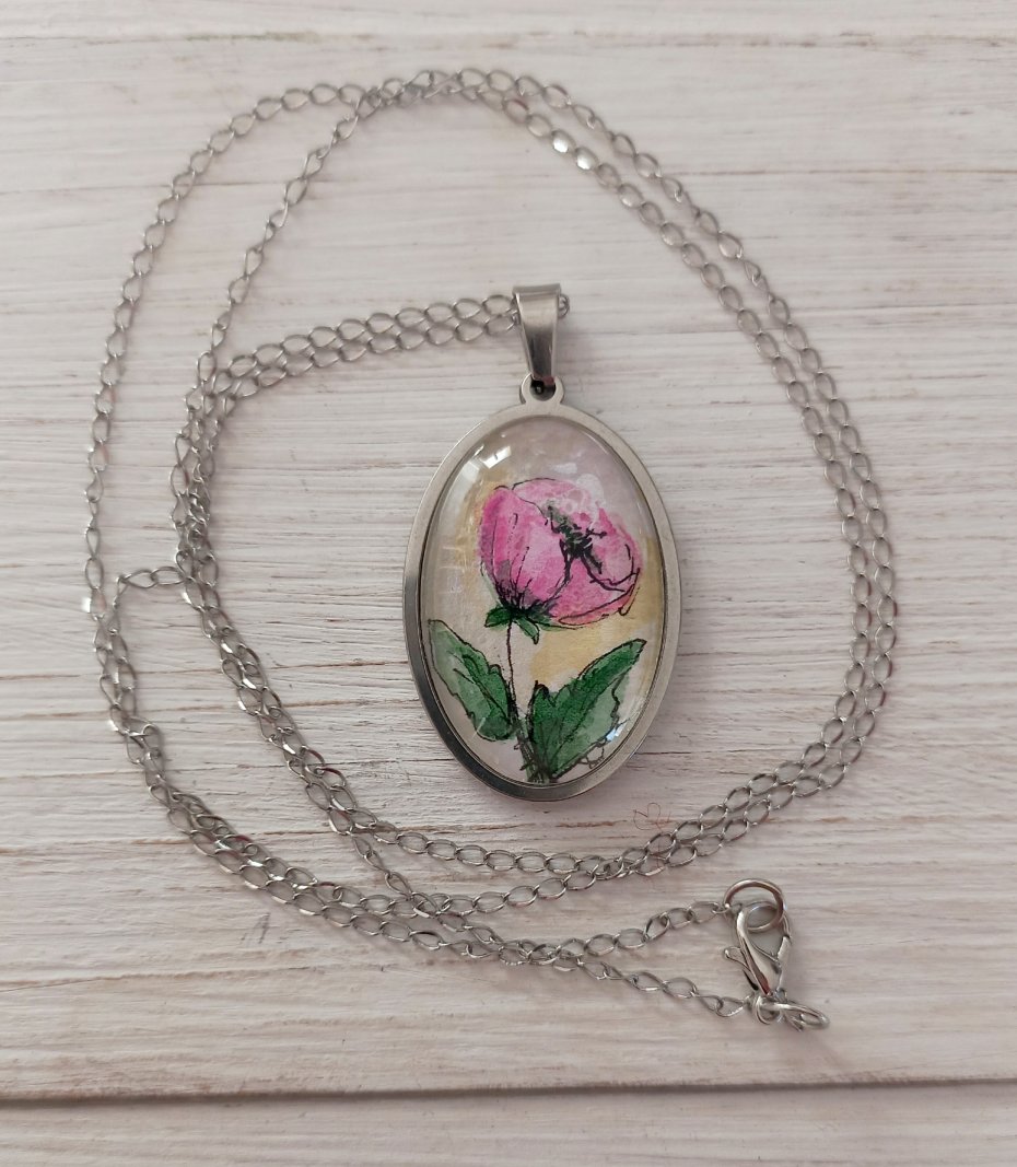 Akwarelowy kwiatek został zabezpieczony kaboszonem i osadzony w prawie ze stali szlachetnej w kolorze srebrnym.