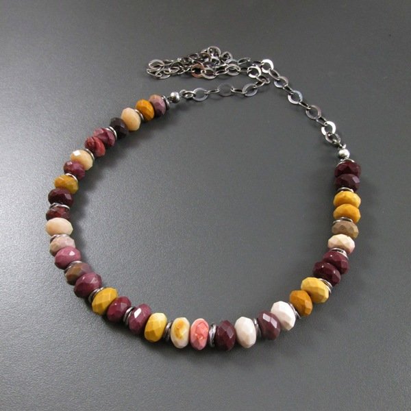 Naszyjnik wykonany z fasetowanych oponek mokaitu 8 mm. Całość wykończona w srebrze 925, oksydowanym i wypolerowanym. Długość naszyjnika wynosi ok.52 cm, w tym kamienie stanowią ok. 23 cm. Elegancko zapakowany.