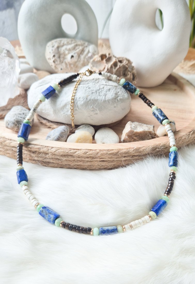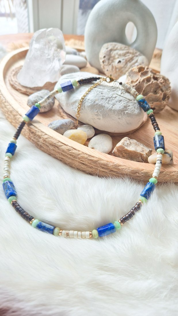 Naszyjnik z kamieni naturalnych lapisow lazuli,chryzoprazu,bronzytu i howlitu.