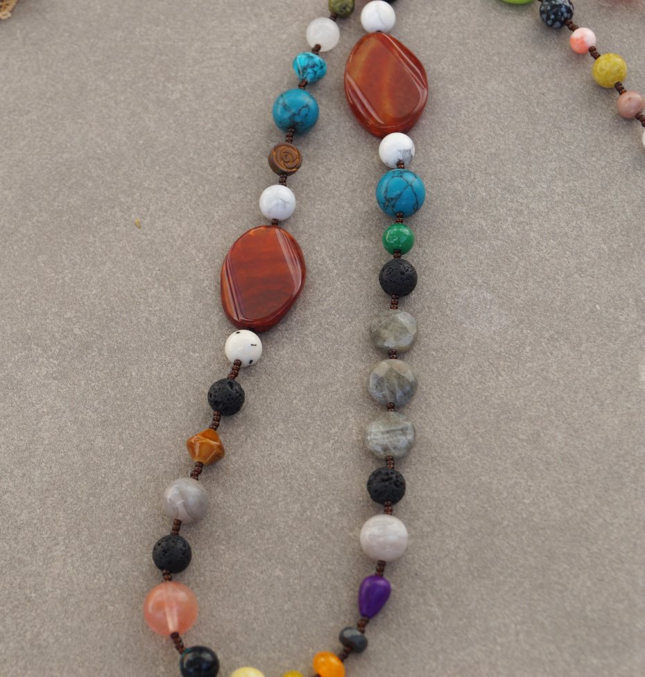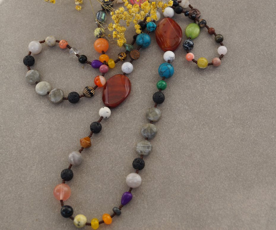 Elegancki, ręcznie wykonany naszyjnik z naturalnych minerałów o średnicy od 4 do 40 mm. Wykorzystano kamienie takie jak labradoryt, agat, jadeit, lawa, turkus, kwarc oraz inne naturalne minerały, oddzielone od siebie drobnymi szklanymi koralikami, które dodają lekkości i połysku.