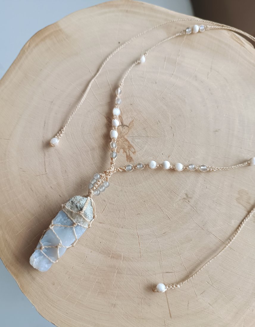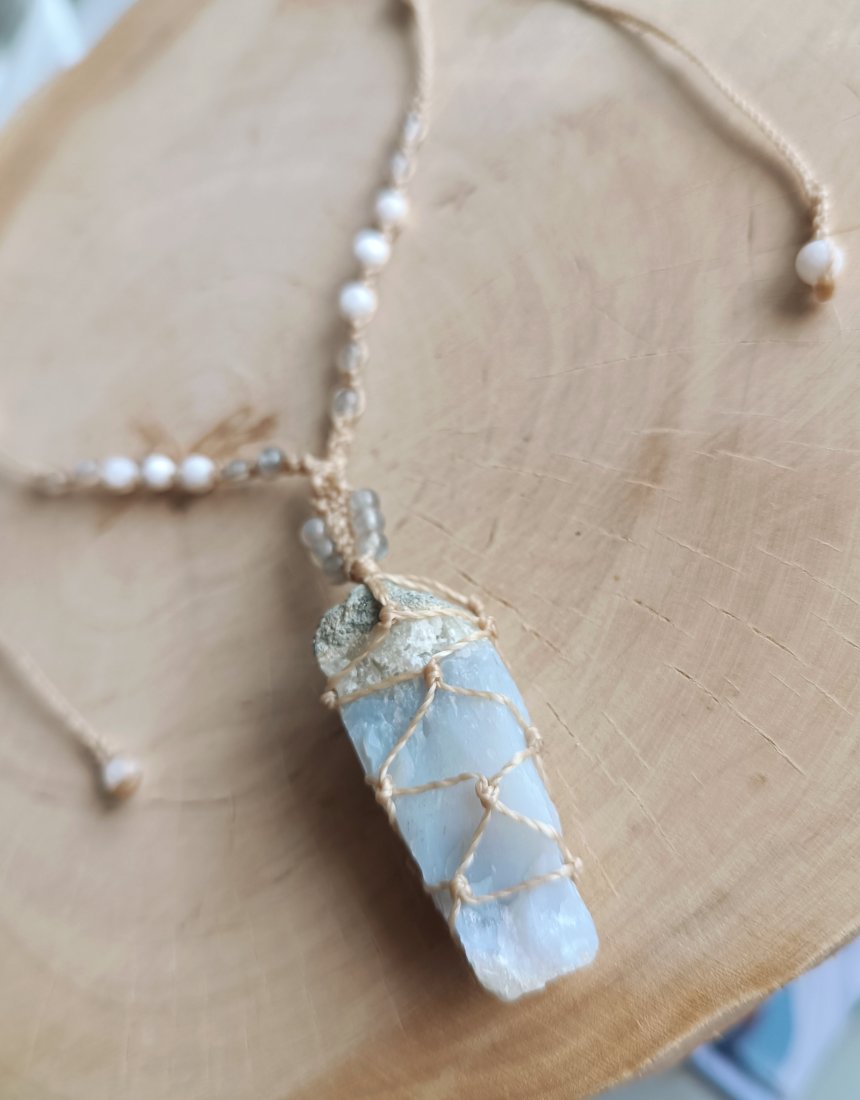 Naszyjnik z kalcytem niebieskim (wielkość kamienia- 1,8/ 4,7 cm) Dodatkowe kamienie to labradoryt (4 mm) i masa perłowa (5mm).
