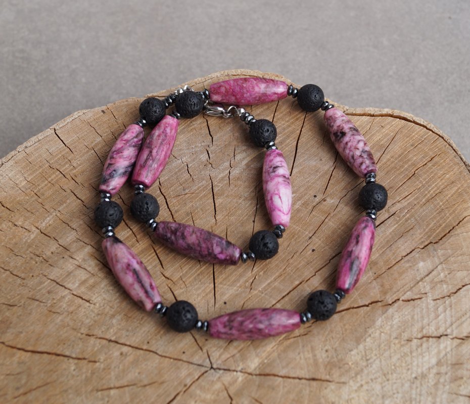 Elegancki naszyjnik wykonany z naturalnych minerałów. Centralnym elementem są efektowne koraliki jaspisu w kształcie oliwki o wymiarach 30 mm, które pięknie komponują się z matowymi kulkami lawy wulkanicznej o średnicy 10 mm. Całość uzupełniają stylowe przekładki z hematytu, nadające biżuterii subtelnego blasku i nowoczesnego charakteru.