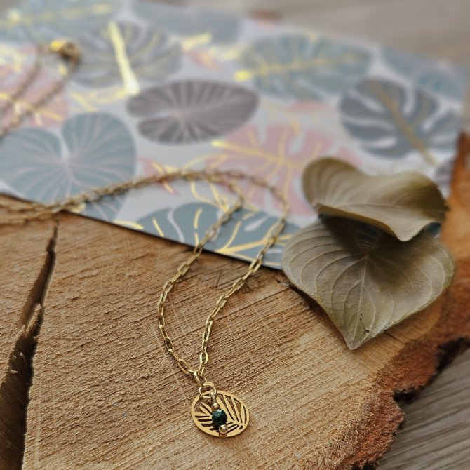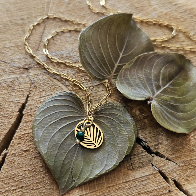 Naszyjnik z wakacyjnym motywem palmy oraz malutkim, ciemnozielonym malachitem to delikatna biżuteria idealna na lato! Łańcuszek oraz zawieszka wykonane zostały ze stali szlachetnej w kolorze złotym, który wraz z intrygującą zielenią malachitu tworzy klasyczny, ponadczasowy duet, który zawsze się sprawdza!