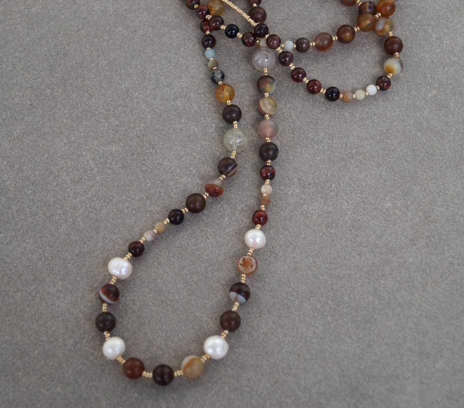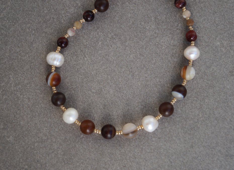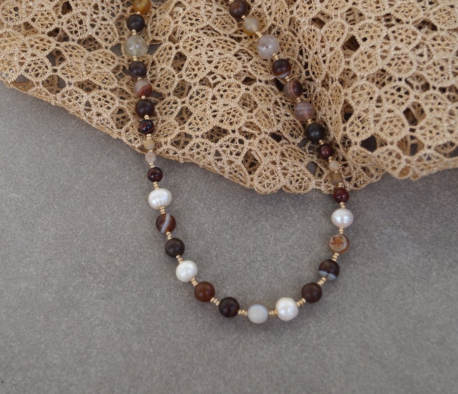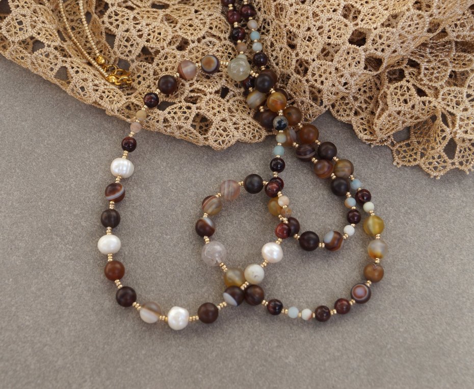 Materiały: perły naturalne, agat, chalcedon, szklane koraliki, stal nierdzewna pozłacana