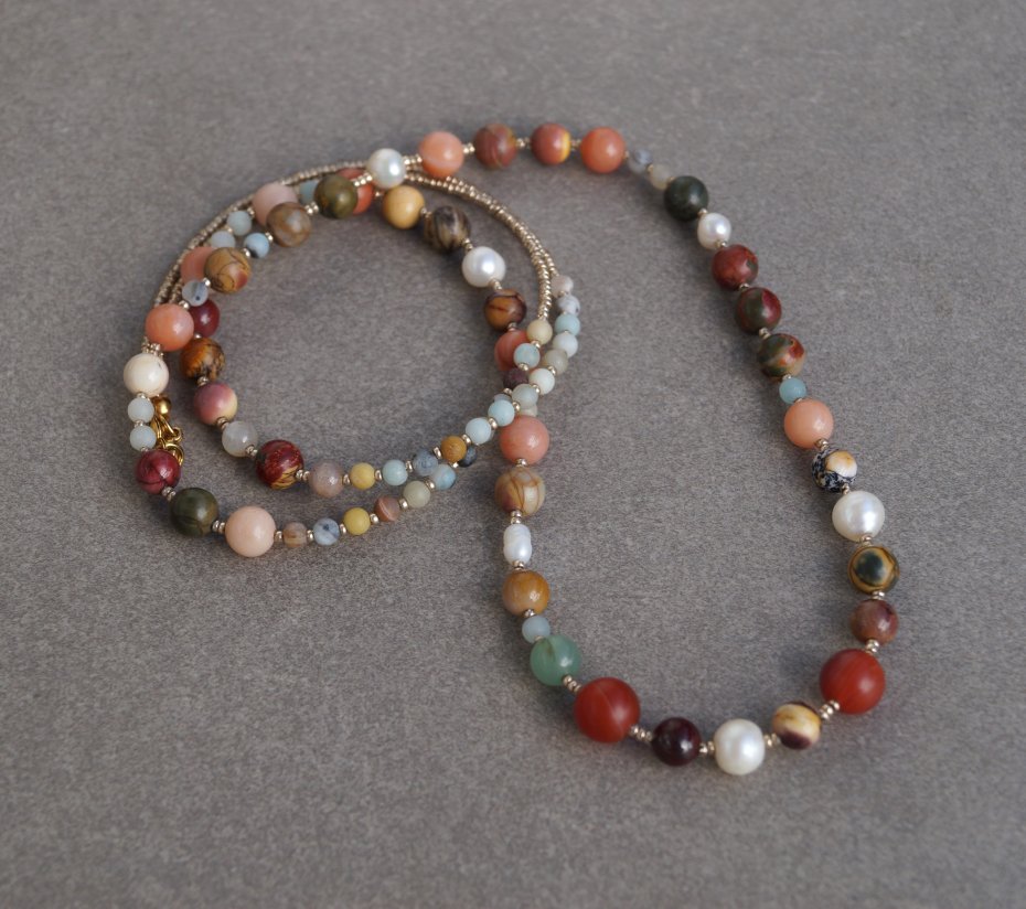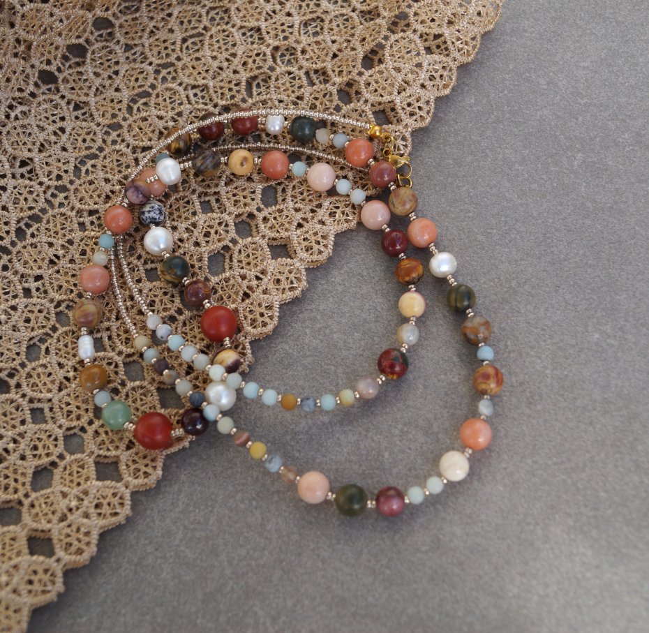 Ręcznie wykonany naszyjnik o długości 100 cm, stworzony z naturalnych minerałów i pereł.