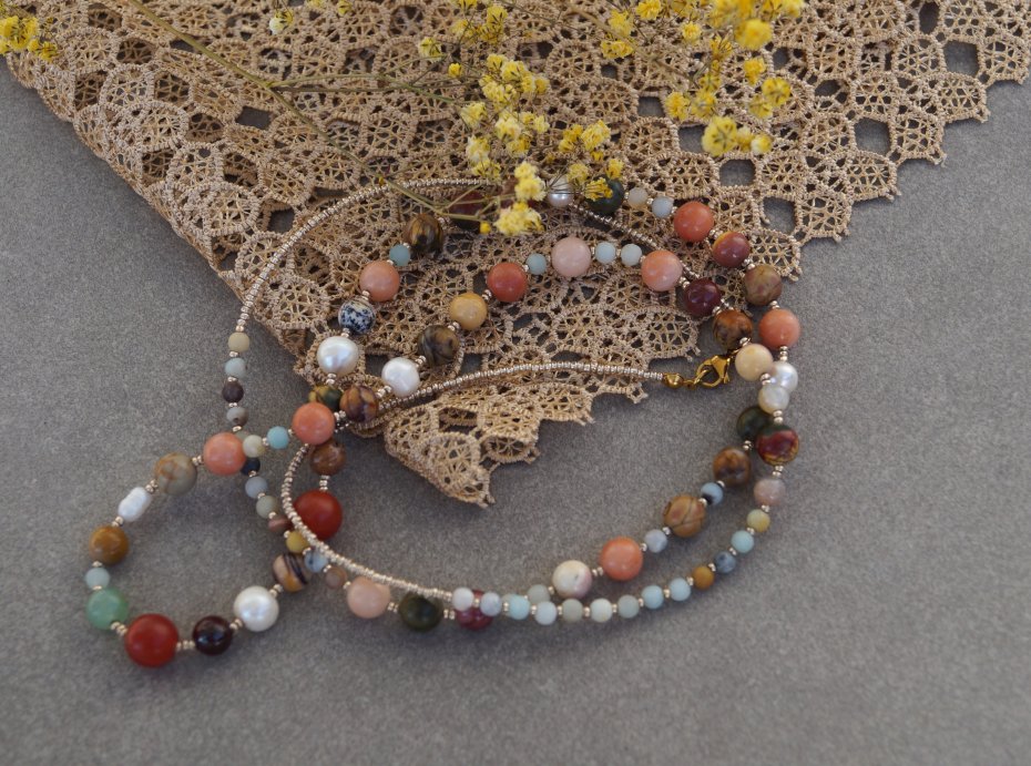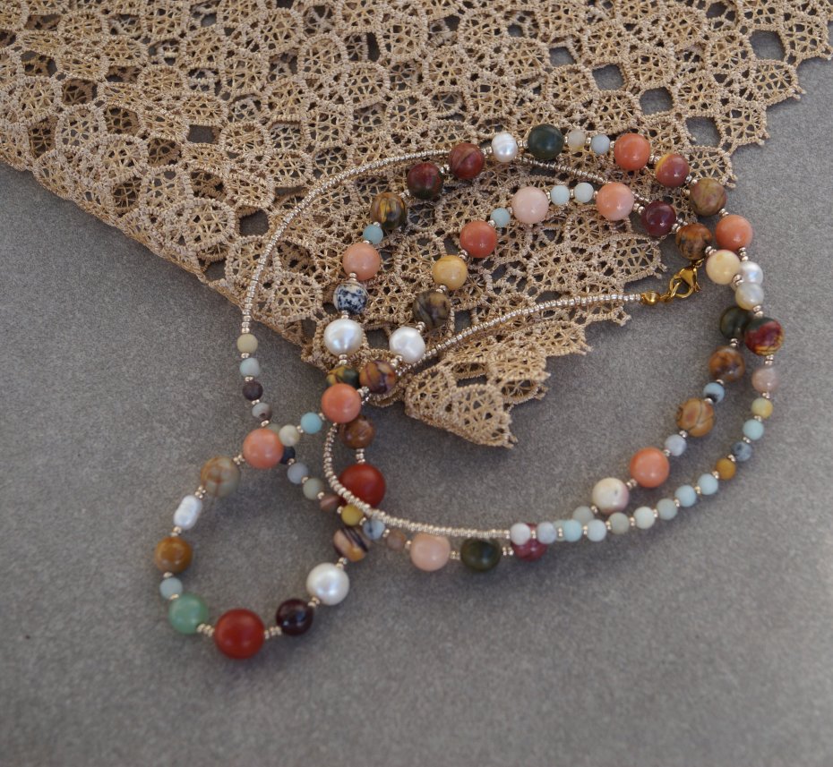 Materiały: perły naturalne, agat, chalcedon, szklane koraliki, stal nierdzewna pozłacana