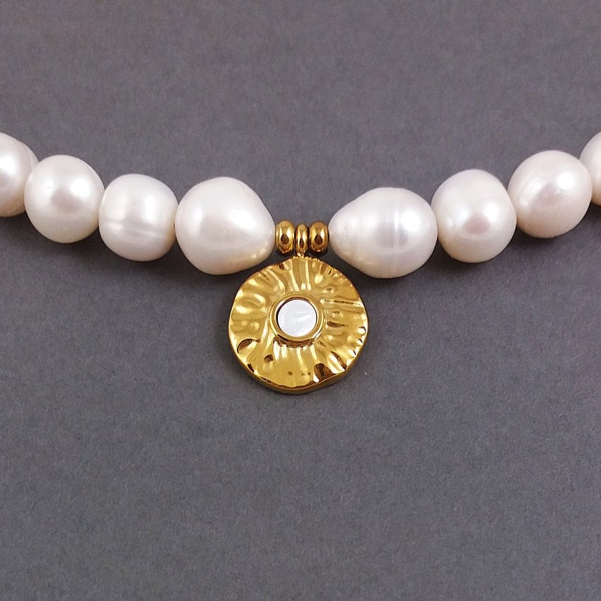 W centralnym miejscu znajduje się zawieszka z nieuczulającej, pozłacanej stali szlachetnej z oczkiem z masy perłowej. Zawieszka ma średnicę 15mm.