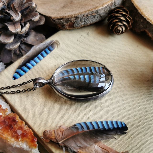 ♥ Naszyjnik owalny z prawdziwym niebieskim piórkiem sójki ♥
