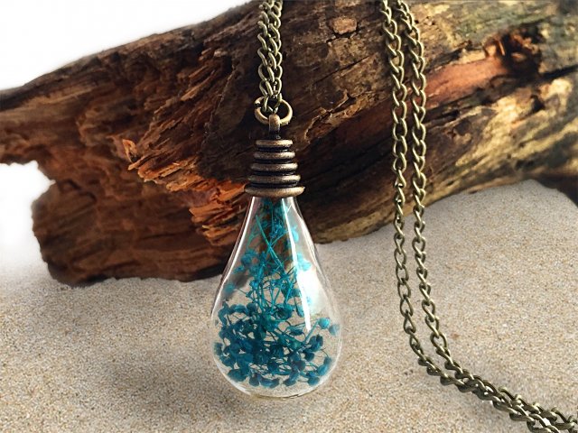 Ręcznie robiony naszyjnik z prawdziwymi kwiatami. Kwiaty zostały umieszczone w szklanej kulce.